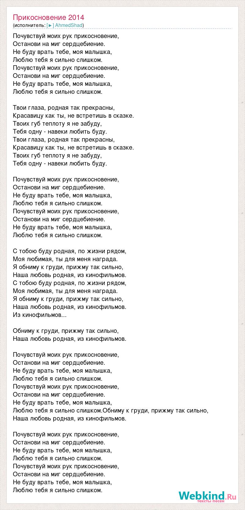 Почувствуй моих рук прикосновение, Останови на миг сердцебиение. Не буду врать тебе, моя малышка, Люблю тебя я сильно слишком. Почувствуй моих рук прикосновение, Останови на миг сердцебиение. Не буду врать тебе, моя малышка, Люблю тебя я сильно слишком. Твои глаза, родная так прекрасны, Красавицу как ты, не встретишь в сказке. Твоих губ теплоту я не забуду, Тебя одну - навеки любить буду. Твои глаза, родная так прекрасны, Красавицу как ты, не встретишь в сказке. Твоих губ теплоту я не забуду, Тебя одну - навеки любить буду. Почувствуй моих рук прикосновение, Останови на миг сердцебиение. Не буду врать тебе, моя малышка, Люблю тебя я сильно слишком. Почувствуй моих рук прикосновение, Останови на миг сердцебиение. Не буду врать тебе, моя малышка, Люблю тебя я сильно слишком. С тобою буду родная, по жизни рядом, Моя любимая, ты для меня награда. Я обниму к груди, прижму так сильно, Наша любовь родная, из кинофильмов. С тобою буду родная, по жизни рядом, Моя любимая, ты для меня награда. Я обниму к груди, прижму так сильно, Наша любовь родная, из кинофильмов. Из кинофильмов... Обниму к груди, прижму так сильно, Наша любовь родная, из кинофильмов. Почувствуй моих рук прикосновение, Останови на миг сердцебиение. Не буду врать тебе, моя малышка, Люблю тебя я сильно слишком. Почувствуй моих рук прикосновение, Останови на миг сердцебиение. Не буду врать тебе, моя малышка, Люблю тебя я сильно слишком.Обниму к груди, прижму так сильно, Наша любовь родная, из кинофильмов. Почувствуй моих рук прикосновение, Останови на миг сердцебиение. Не буду врать тебе, моя малышка, Люблю тебя я сильно слишком. Почувствуй моих рук прикосновение, Останови на миг сердцебиение. Не буду врать тебе, моя малышка, Люблю тебя я сильно слишком.