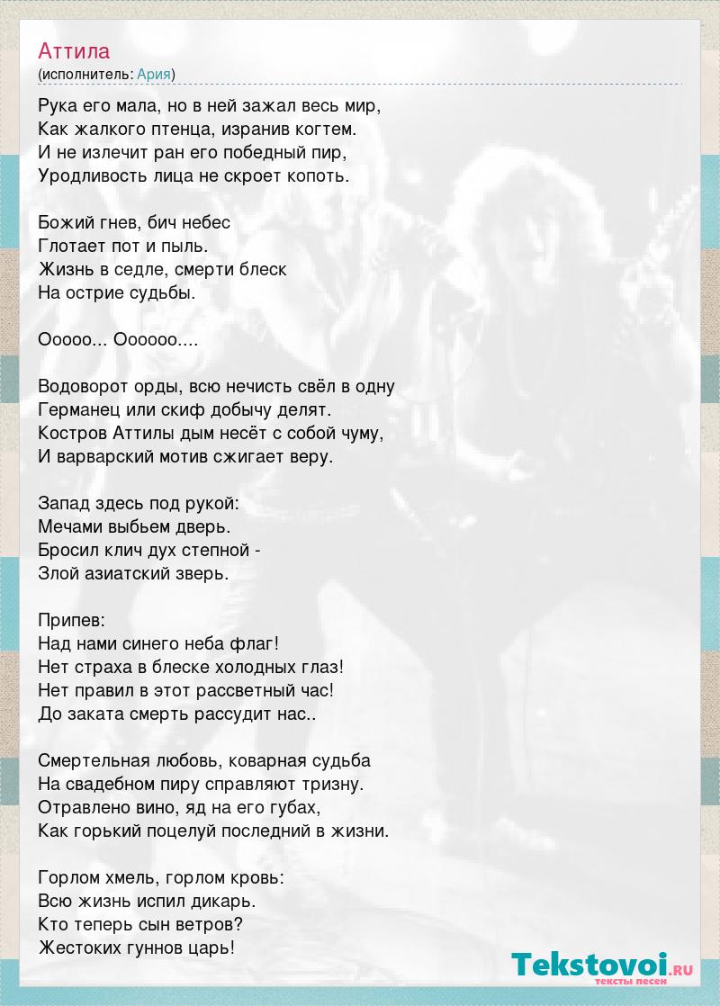 Рука его мала, но в ней зажал весь мир, Как жалкого птенца, изранив когтем. И не излечит ран его победный пир, Уродливость лица не скроет копоть. Божий гнев, бич небес Глотает пот и пыль. Жизнь в седле, смерти блеск На острие судьбы. Ооооо... Оооооо.... Водоворот орды, всю нечисть свёл в одну Германец или скиф добычу делят. Костров Аттилы дым несёт с собой чуму, И варварский мотив сжигает веру. Запад здесь под рукой: Мечами выбьем дверь. Бросил клич дух степной - Злой азиатский зверь. Припев: Над нами синего неба флаг! Нет страха в блеске холодных глаз! Нет правил в этот рассветный час! До заката смерть рассудит нас.. Смертельная любовь, коварная судьба На свадебном пиру справляют тризну. Отравлено вино, яд на его губах, Как горький поцелуй последний в жизни. Горлом хмель, горлом кровь: Всю жизнь испил дикарь. Кто теперь сын ветров? Жестоких гуннов царь!