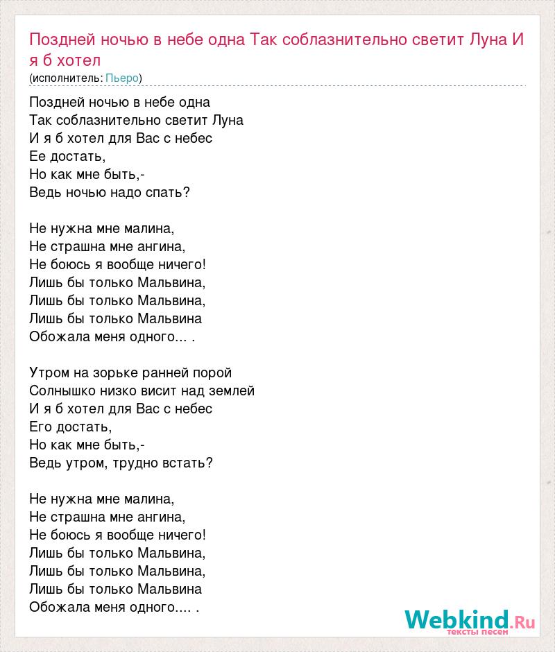 Поздней ночью в небе одна Так соблазнительно светит Луна И я б хотел для Вас с небес Ее достать, Но как мне быть,- Ведь ночью надо спать? Не нужна мне малина, Не страшна мне ангина, Не боюсь я вообще ничего! Лишь бы только Мальвина, Лишь бы только Мальвина, Лишь бы только Мальвина Обожала меня одного... . Утром на зорьке ранней порой Солнышко низко висит над землей И я б хотел для Вас с небес Его достать, Но как мне быть,- Ведь утром, трудно встать? Не нужна мне малина, Не страшна мне ангина, Не боюсь я вообще ничего! Лишь бы только Мальвина, Лишь бы только Мальвина, Лишь бы только Мальвина Обожала меня одного.... .