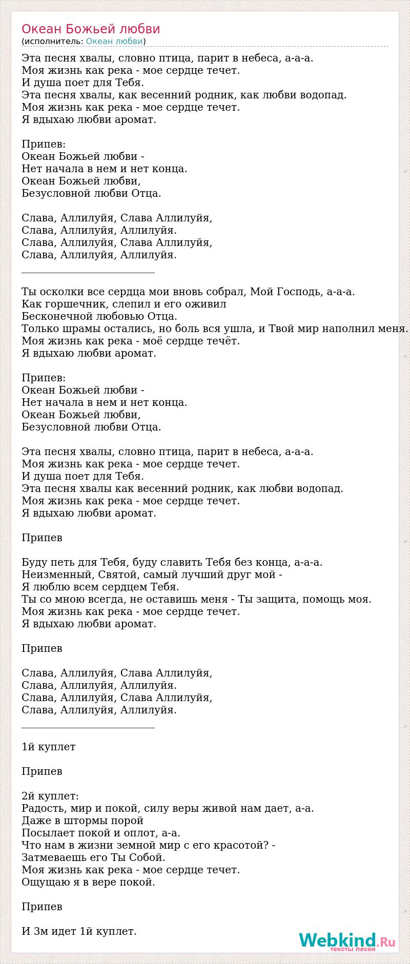 Эта песня хвалы, словно птица, парит в небеса, а-а-а. Моя жизнь как река - мое сердце течет. И душа поет для Тебя. Эта песня хвалы, как весенний родник, как любви водопад. Моя жизнь как река - мое сердце течет. Я вдыхаю любви аромат. Припев: Океан Божьей любви - Нет начала в нем и нет конца. Океан Божьей любви, Безусловной любви Отца. Слава, Аллилуйя, Слава Аллилуйя, Слава, Аллилуйя, Аллилуйя. Слава, Аллилуйя, Слава Аллилуйя, Слава, Аллилуйя, Аллилуйя. __________________________ Ты осколки все сердца мои вновь собрал, Мой Господь, а-а-а. Как горшечник, слепил и его оживил Бесконечной любовью Отца. Только шрамы остались, но боль вся ушла, и Твой мир наполнил меня. Моя жизнь как река - моё сердце течёт. Я вдыхаю любви аромат. Припев: Океан Божьей любви - Нет начала в нем и нет конца. Океан Божьей любви, Безусловной любви Отца. Эта песня хвалы, словно птица, парит в небеса, а-а-а. Моя жизнь как река - мое сердце течет. И душа поет для Тебя. Эта песня хвалы как весенний родник, как любви водопад. Моя жизнь как река - мое сердце течет. Я вдыхаю любви аромат. Припев Буду петь для Тебя, буду славить Тебя без конца, а-а-а. Неизменный, Святой, самый лучший друг мой - Я люблю всем сердцем Тебя. Ты со мною всегда, не оставишь меня - Ты защита, помощь моя. Моя жизнь как река - мое сердце течет. Я вдыхаю любви аромат. Припев Слава, Аллилуйя, Слава Аллилуйя, Слава, Аллилуйя, Аллилуйя. Слава, Аллилуйя, Слава Аллилуйя, Слава, Аллилуйя, Аллилуйя. __________________________ 1й куплет Припев 2й куплет: Радость, мир и покой, силу веры живой нам дает, а-а. Даже в штормы порой Посылает покой и оплот, а-а. Что нам в жизни земной мир с его красотой? - Затмеваешь его Ты Собой. Моя жизнь как река - мое сердце течет. Ощущаю я в вере покой. Припев И 3м идет 1й куплет.