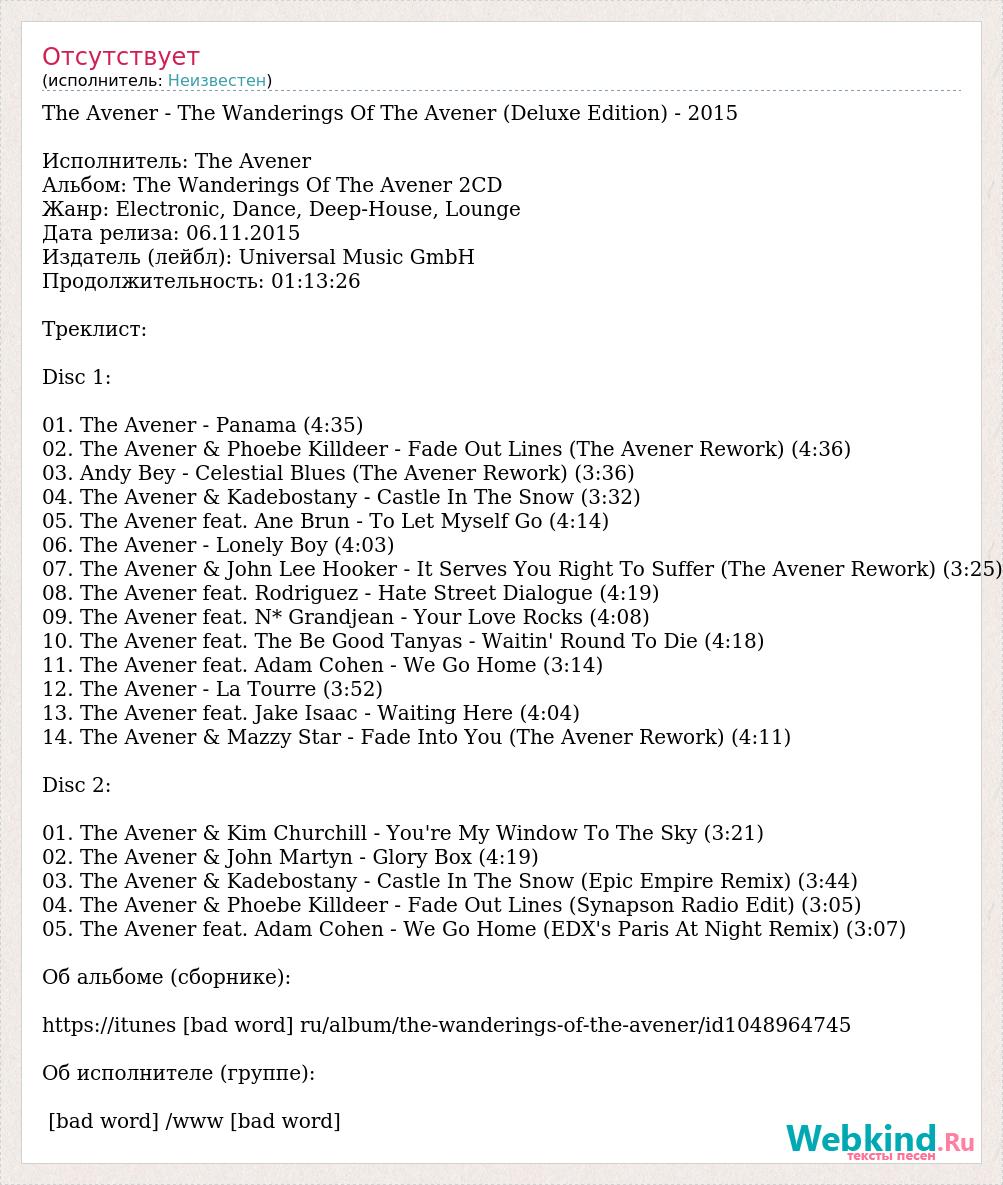 The Avener - The Wanderings Of The Avener (Deluxe Edition) - 2015 Исполнитель: The Avener Альбом: The Wanderings Of The Avener 2CD Жанр: Electronic, Dance, Deep-House, Lounge Дата релиза: 06.11.2015 Издатель (лейбл): Universal Music GmbH Продолжительность: 01:13:26 Треклист: Disc 1: 01. The Avener - Panama (4:35) 02. The Avener & Phoebe Killdeer - Fade Out Lines (The Avener Rework) (4:36) 03. Andy Bey - Celestial Blues (The Avener Rework) (3:36) 04. The Avener & Kadebostany - Castle In The Snow (3:32) 05. The Avener feat. Ane Brun - To Let Myself Go (4:14) 06. The Avener - Lonely Boy (4:03) 07. The Avener & John Lee Hooker - It Serves You Right To Suffer (The Avener Rework) (3:25) 08. The Avener feat. Rodriguez - Hate Street Dialogue (4:19) 09. The Avener feat. N* Grandjean - Your Love Rocks (4:08) 10. The Avener feat. The Be Good Tanyas - Waitin' Round To Die (4:18) 11. The Avener feat. Adam Cohen - We Go Home (3:14) 12. The Avener - La Tourre (3:52) 13. The Avener feat. Jake Isaac - Waiting Here (4:04) 14. The Avener & Mazzy Star - Fade Into You (The Avener Rework) (4:11) Disc 2: 01. The Avener & Kim Churchill - You're My Window To The Sky (3:21) 02. The Avener & John Martyn - Glory Box (4:19) 03. The Avener & Kadebostany - Castle In The Snow (Epic Empire Remix) (3:44) 04. The Avener & Phoebe Killdeer - Fade Out Lines (Synapson Radio Edit) (3:05) 05. The Avener feat. Adam Cohen - We Go Home (EDX's Paris At Night Remix) (3:07) Об альбоме (сборнике): https://itunes [bad word] ru/album/the-wanderings-of-the-avener/id1048964745 Об исполнителе (группе): [bad word] /www [bad word]