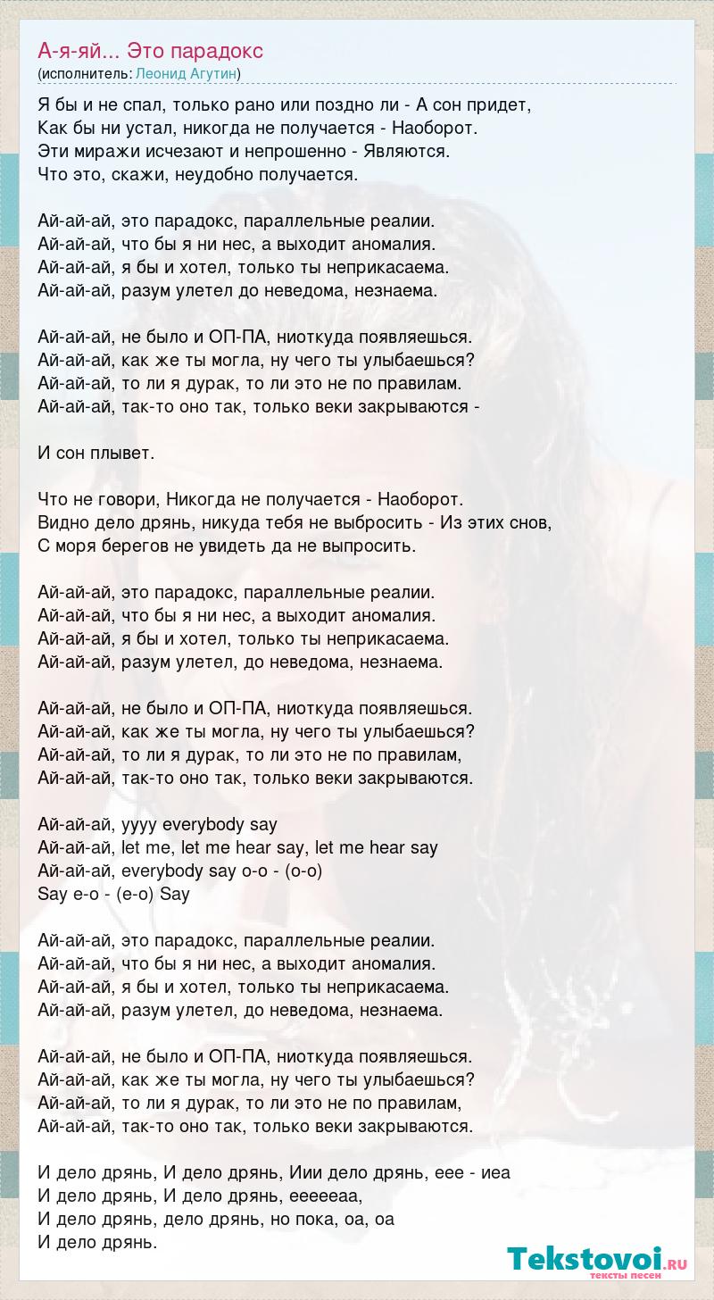 Я бы и не спал, только рано или поздно ли - А сон придет, Как бы ни устал, никогда не получается - Наоборот. Эти миражи исчезают и непрошенно - Являются. Что это, скажи, неудобно получается. Ай-ай-ай, это парадокс, параллельные реалии. Ай-ай-ай, что бы я ни нес, а выходит аномалия. Ай-ай-ай, я бы и хотел, только ты неприкасаема. Ай-ай-ай, разум улетел до неведома, незнаема. Ай-ай-ай, не было и ОП-ПА, ниоткуда появляешься. Ай-ай-ай, как же ты могла, ну чего ты улыбаешься? Ай-ай-ай, то ли я дурак, то ли это не по правилам. Ай-ай-ай, так-то оно так, только веки закрываются - И сон плывет. Что не говори, Никогда не получается - Наоборот. Видно дело дрянь, никуда тебя не выбросить - Из этих снов, С моря берегов не увидеть да не выпросить. Ай-ай-ай, это парадокс, параллельные реалии. Ай-ай-ай, что бы я ни нес, а выходит аномалия. Ай-ай-ай, я бы и хотел, только ты неприкасаема. Ай-ай-ай, разум улетел, до неведома, незнаема. Ай-ай-ай, не было и ОП-ПА, ниоткуда появляешься. Ай-ай-ай, как же ты могла, ну чего ты улыбаешься? Ай-ай-ай, то ли я дурак, то ли это не по правилам, Ай-ай-ай, так-то оно так, только веки закрываются. Ай-ай-ай, уууу everybody say Ай-ай-ай, let me, let me hear say, let me hear say Ай-ай-ай, everybody say o-o - (o-o) Say e-o - (e-o) Say Ай-ай-ай, это парадокс, параллельные реалии. Ай-ай-ай, что бы я ни нес, а выходит аномалия. Ай-ай-ай, я бы и хотел, только ты неприкасаема. Ай-ай-ай, разум улетел, до неведома, незнаема. Ай-ай-ай, не было и ОП-ПА, ниоткуда появляешься. Ай-ай-ай, как же ты могла, ну чего ты улыбаешься? Ай-ай-ай, то ли я дурак, то ли это не по правилам, Ай-ай-ай, так-то оно так, только веки закрываются. И дело дрянь, И дело дрянь, Иии дело дрянь, еее - иеа И дело дрянь, И дело дрянь, еееееаа, И дело дрянь, дело дрянь, но пока, оа, оа И дело дрянь.