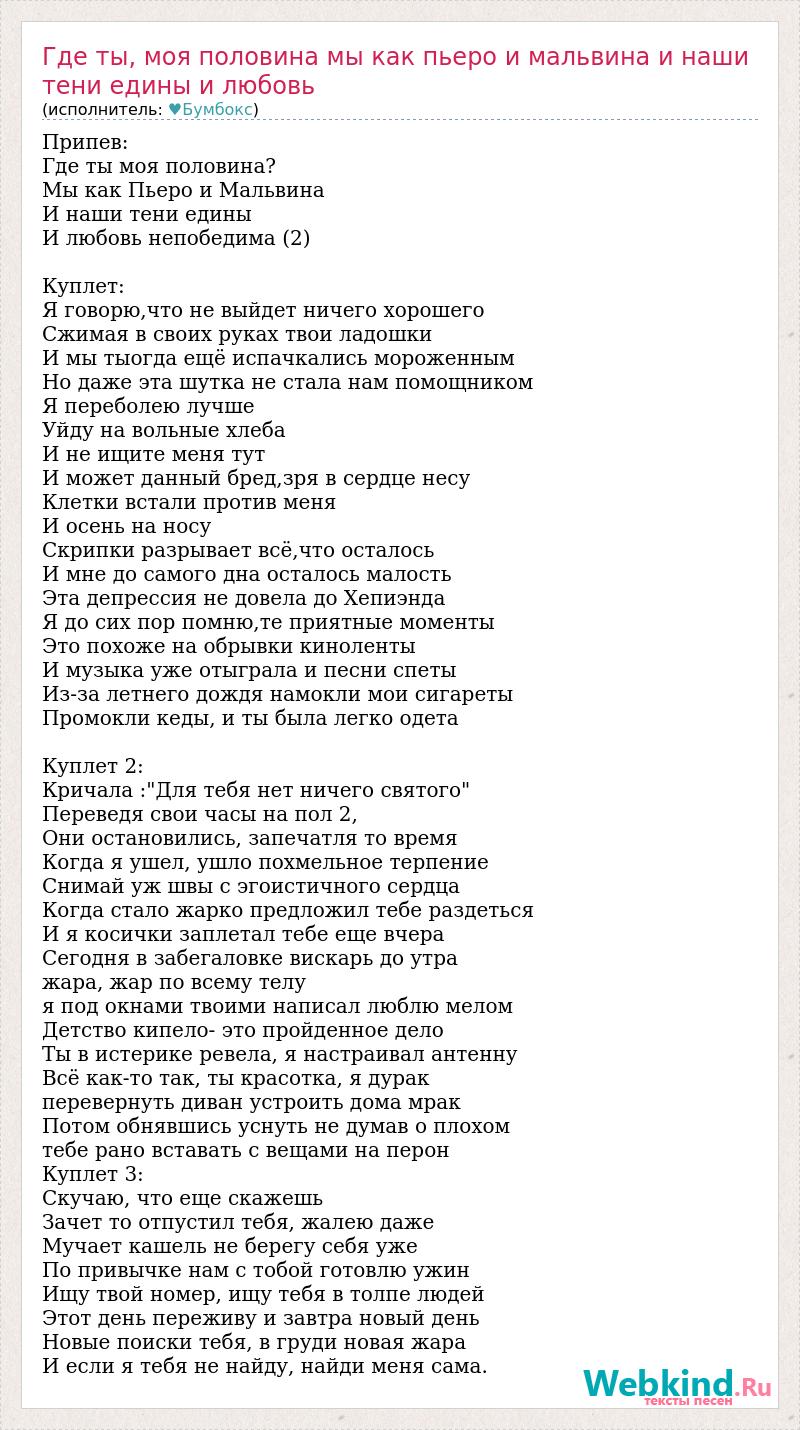 Припев: Где ты моя половина? Мы как Пьеро и Мальвина И наши тени едины И любовь непобедима (2) Куплет: Я говорю,что не выйдет ничего хорошего Сжимая в своих руках твои ладошки И мы тыогда ещё испачкались мороженным Но даже эта шутка не стала нам помощником Я переболею лучше Уйду на вольные хлеба И не ищите меня тут И может данный бред,зря в сердце несу Клетки встали против меня И осень на носу Скрипки разрывает всё,что осталось И мне до самого дна осталось малость Эта депрессия не довела до Хепиэнда Я до сих пор помню,те приятные моменты Это похоже на обрывки киноленты И музыка уже отыграла и песни спеты Из-за летнего дождя намокли мои сигареты Промокли кеды, и ты была легко одета Куплет 2: Кричала :"Для тебя нет ничего святого" Переведя свои часы на пол 2, Они остановились, запечатля то время Когда я ушел, ушло похмельное терпение Снимай уж швы с эгоистичного сердца Когда стало жарко предложил тебе раздеться И я косички заплетал тебе еще вчера Сегодня в забегаловке вискарь до утра жара, жар по всему телу я под окнами твоими написал люблю мелом Детство кипело- это пройденное дело Ты в истерике ревела, я настраивал антенну Всё как-то так, ты красотка, я дурак перевернуть диван устроить дома мрак Потом обнявшись уснуть не думав о плохом тебе рано вставать с вещами на перон Куплет 3: Скучаю, что еще скажешь Зачет то отпустил тебя, жалею даже Мучает кашель не берегу себя уже По привычке нам с тобой готовлю ужин Ищу твой номер, ищу тебя в толпе людей Этот день переживу и завтра новый день Новые поиски тебя, в груди новая жара И если я тебя не найду, найди меня сама.