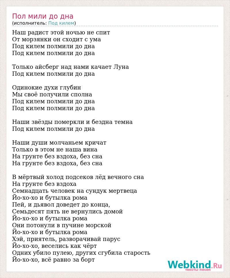 Наш радист этой ночью не спит От морзянки он сходит с ума Под килем полмили до дна Под килем полмили до дна Только айсберг над нами качает Луна Под килем полмили до дна Одинокие духи глубин Мы своё получили сполна Под килем полмили до дна Под килем полмили до дна Наши звёзды померкли и бездна темна Под килем полмили до дна Наши души молчаньем кричат Только в этом не наша вина На грунте без вздоха, без сна На грунте без вздоха, без сна В мёртвый холод подсеков лёд вечного сна На грунте без вздоха Семнадцать человек на сундук мертвеца Йо-хо-хо и бутылка рома Пей, и дьявол доведет до конца, Семьдесят пять не вернулись домой Йо-хо-хо и бутылка рома Они потонули в пучине морской Йо-хо-хо и бутылка рома Хэй, приятель, разворачивай парус Йо-хо-хо, веселись как чёрт Одних убило пулею, других сгубила старость Йо-хо-хо, всё равно за борт