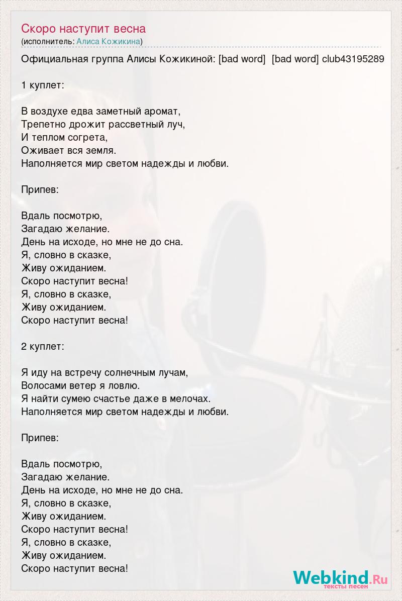 Официальная группа Алисы Кожикиной: [bad word] [bad word] club43195289 1 куплет: В воздухе едва заметный аромат, Трепетно дрожит рассветный луч, И теплом согрета, Оживает вся земля. Наполняется мир светом надежды и любви. Припев: Вдаль посмотрю, Загадаю желание. День на исходе, но мне не до сна. Я, словно в сказке, Живу ожиданием. Скоро наступит весна! Я, словно в сказке, Живу ожиданием. Скоро наступит весна! 2 куплет: Я иду на встречу солнечным лучам, Волосами ветер я ловлю. Я найти сумею счастье даже в мелочах. Наполняется мир светом надежды и любви. Припев: Вдаль посмотрю, Загадаю желание. День на исходе, но мне не до сна. Я, словно в сказке, Живу ожиданием. Скоро наступит весна! Я, словно в сказке, Живу ожиданием. Скоро наступит весна!