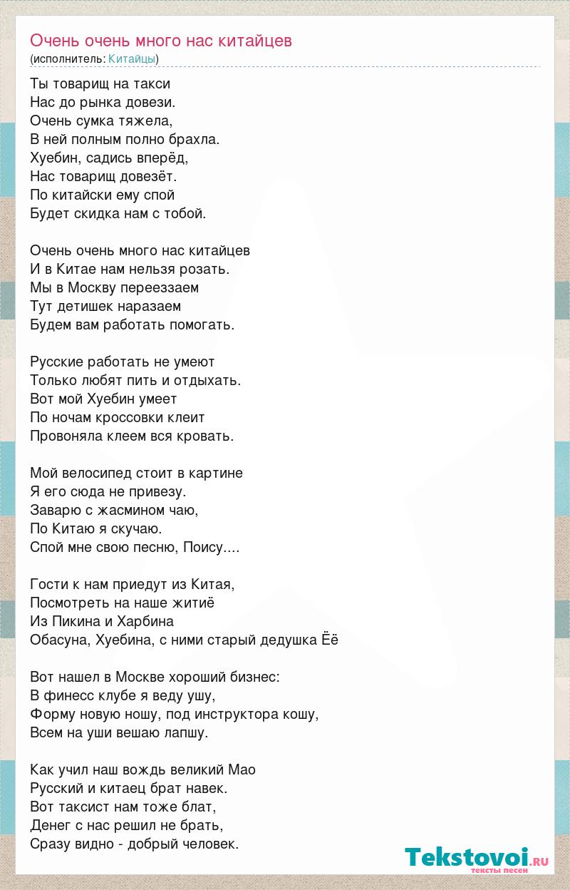Ты товарищ на такси Нас до рынка довези. Очень сумка тяжела, В ней полным полно брахла. Хуебин, садись вперёд, Нас товарищ довезёт. По китайски ему спой Будет скидка нам с тобой. Очень очень много нас китайцев И в Китае нам нельзя розать. Мы в Москву перееззаем Тут детишек наразаем Будем вам работать помогать. Русские работать не умеют Только любят пить и отдыхать. Вот мой Хуебин умеет По ночам кроссовки клеит Провоняла клеем вся кровать. Мой велосипед стоит в картине Я его сюда не привезу. Заварю с жасмином чаю, По Китаю я скучаю. Спой мне свою песню, Поису.... Гости к нам приедут из Китая, Посмотреть на наше житиё Из Пикина и Харбина Обасуна, Хуебина, с ними старый дедушка Ёё Вот нашел в Москве хороший бизнес: В финесс клубе я веду ушу, Форму новую ношу, под инструктора кошу, Всем на уши вешаю лапшу. Как учил наш вождь великий Мао Русский и китаец брат навек. Вот таксист нам тоже блат, Денег с нас решил не брать, Сразу видно - добрый человек.