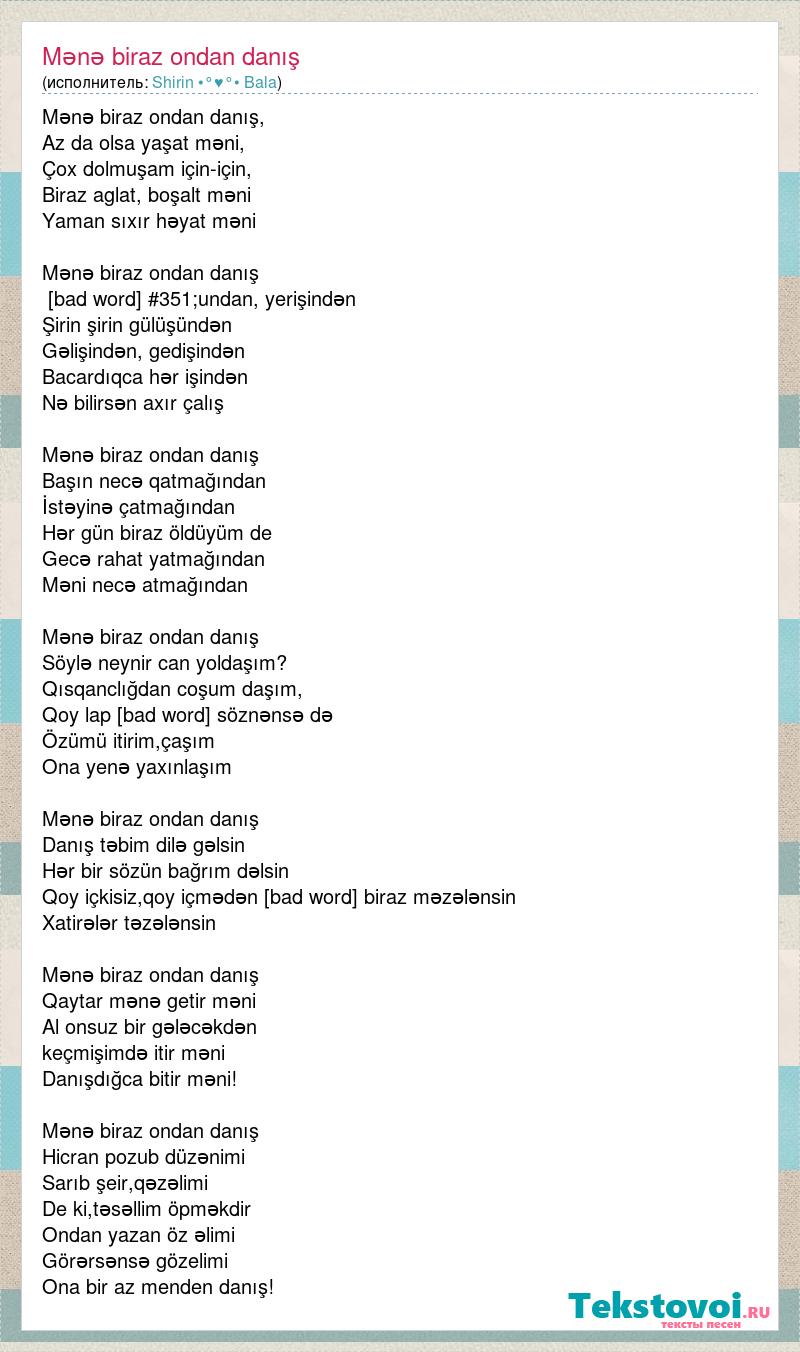 Mənə biraz ondan danış, Az da olsa yaşat məni, Çox dolmuşam için-için, Biraz aglat, boşalt məni Yaman sıxır həyat məni Mənə biraz ondan danış [bad word] #351;undan, yerişindən Şirin şirin gülüşündən Gəlişindən, gedişindən Bacardıqca hər işindən Nə bilirsən axır çalış Mənə biraz ondan danış Başın necə qatmağından İstəyinə çatmağından Hər gün biraz öldüyüm de Gecə rahat yatmağından Məni necə atmağından Mənə biraz ondan danış Söylə neynir can yoldaşım? Qısqanclığdan coşum daşım, Qoy lap [bad word] söznənsə də Özümü itirim,çaşım Ona yenə yaxınlaşım Mənə biraz ondan danış Danış təbim dilə gəlsin Hər bir sözün bağrım dəlsin Qoy içkisiz,qoy içmədən [bad word] biraz məzələnsin Xatirələr təzələnsin Mənə biraz ondan danış Qaytar mənə getir məni Al onsuz bir gələcəkdən keçmişimdə itir məni Danışdığca bitir məni! Mənə biraz ondan danış Hicran pozub düzənimi Sarıb şeir,qəzəlimi De ki,təsəllim öpməkdir Ondan yazan öz əlimi Görərsənsə gözelimi Ona bir az menden danış!