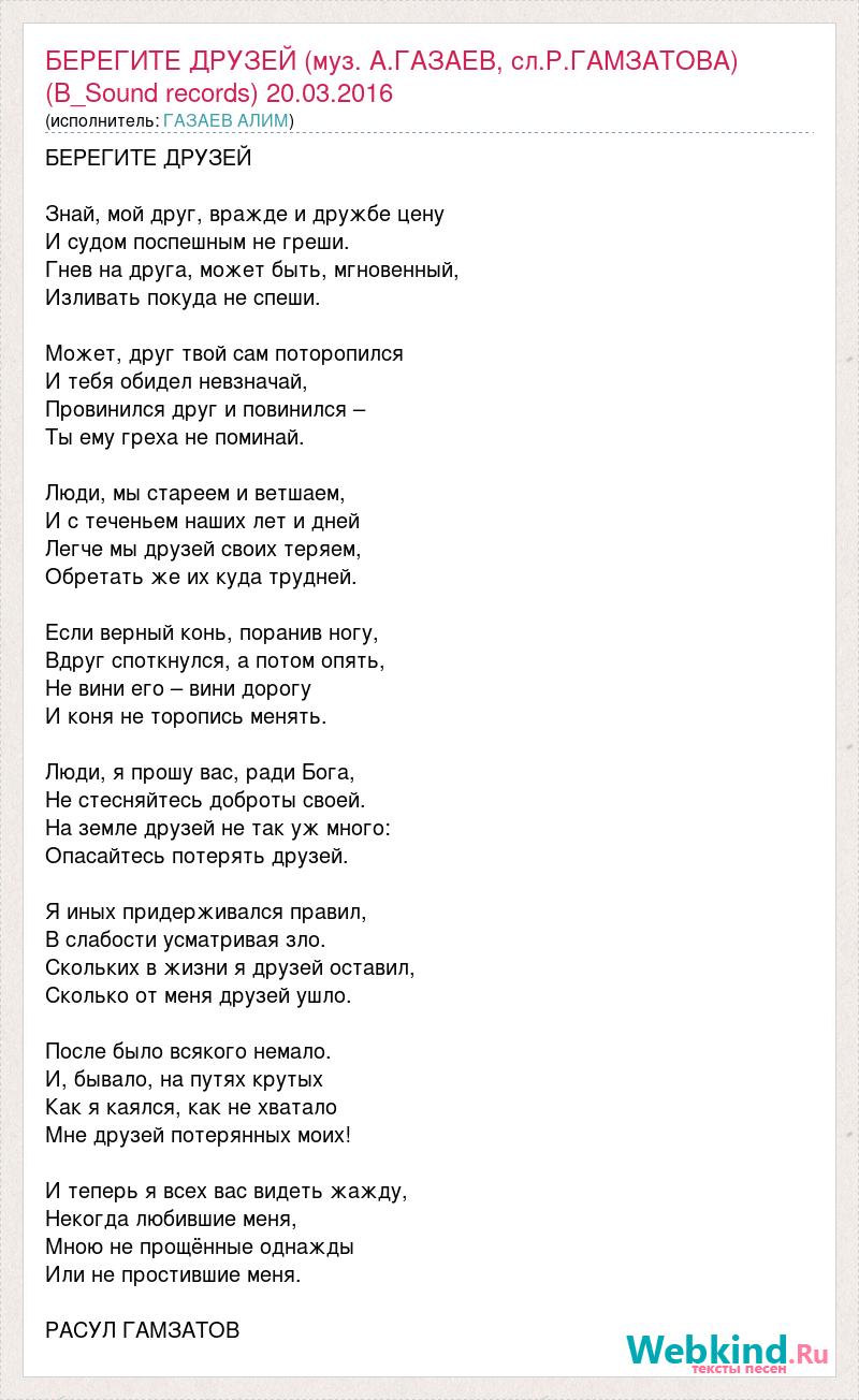А как ты думаешь, о чем песня "БЕРЕГИТЕ ДРУЗЕЙ (муз. А.ГАЗАЕВ, сл.Р.ГАМЗАТОВА) (B_Sound records) 20.03.2016" ?