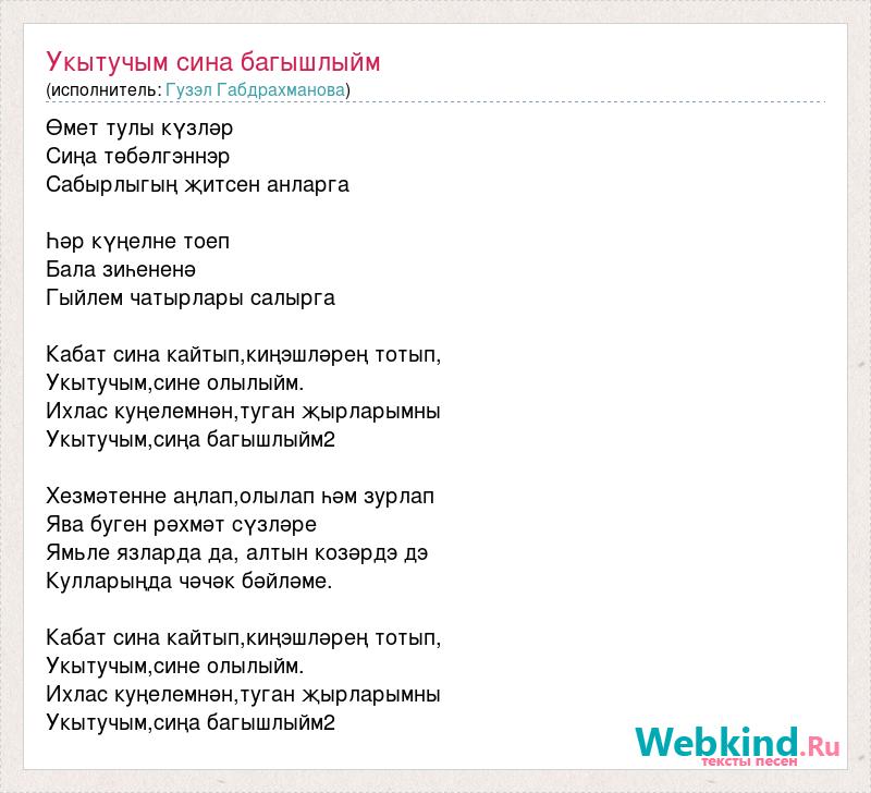 Өмет тулы күзләр Сиңа төбәлгэннэр Сабырлыгың җитсен анларга Һәр күңелне тоеп Бала зиһененә Гыйлем чатырлары салырга Кабат сина кайтып,киңэшләрең тотып, Укытучым,сине олылыйм. Ихлас куңелемнән,туган җырларымны Укытучым,сиңа багышлыйм2 Хезмәтенне аңлап,олылап һәм зурлап Ява буген рәхмәт сүзләре Ямьле язларда да, алтын козәрдэ дэ Кулларыңда чәчәк бәйләме. Кабат сина кайтып,киңэшләрең тотып, Укытучым,сине олылыйм. Ихлас куңелемнән,туган җырларымны Укытучым,сиңа багышлыйм2