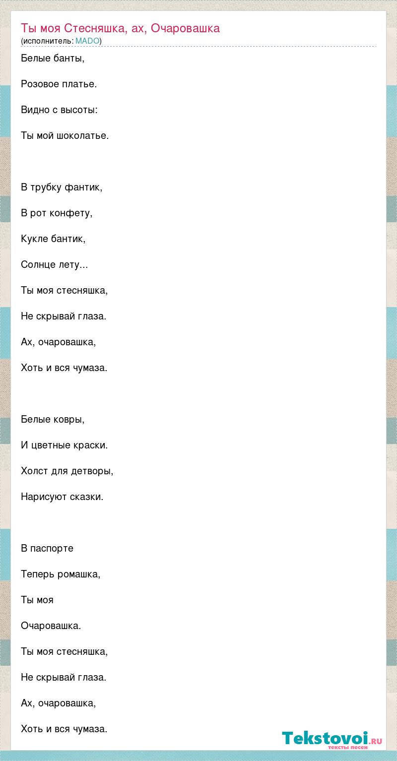 Белые банты, Розовое платье. Видно с высоты: Ты мой шоколатье. В трубку фантик, В рот конфету, Кукле бантик, Солнце лету... Ты моя стесняшка, Не скрывай глаза. Ах, очаровашка, Хоть и вся чумаза. Белые ковры, И цветные краски. Холст для детворы, Нарисуют сказки. В паспорте Теперь ромашка, Ты моя Очаровашка. Ты моя стесняшка, Не скрывай глаза. Ах, очаровашка, Хоть и вся чумаза.