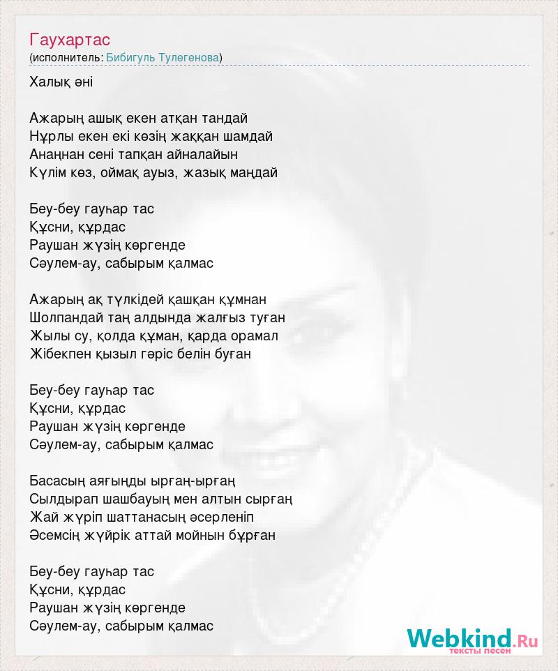 Халық әні Ажарың ашық екен атқан тандай Нұрлы екен екі көзің жаққан шамдай Анаңнан сені тапқан айналайын Күлім көз, оймақ ауыз, жазық маңдай Беу-беу гауһар тас Құсни, құрдас Раушан жүзің көргенде Сәулем-ау, сабырым қалмас Ажарың ақ түлкідей қашқан құмнан Шолпандай таң алдында жалғыз туған Жылы су, қолда құман, қарда орамал Жібекпен қызыл гәріс белін буған Беу-беу гауһар тас Құсни, құрдас Раушан жүзің көргенде Сәулем-ау, сабырым қалмас Басасың аяғыңды ырғаң-ырғаң Сылдырап шашбауың мен алтын сырғаң Жай жүріп шаттанасың әсерленіп Әсемсің жүйрік аттай мойнын бұрған Беу-беу гауһар тас Құсни, құрдас Раушан жүзің көргенде Сәулем-ау, сабырым қалмас