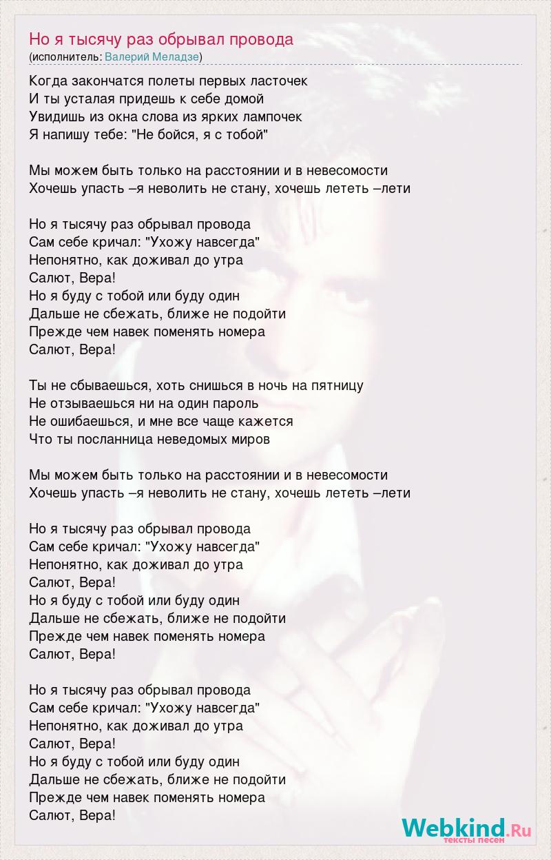 Когда закончатся полеты первых ласточек И ты усталая придешь к себе домой Увидишь из окна слова из ярких лампочек Я напишу тебе: "Не бойся, я с тобой" Мы можем быть только на расстоянии и в невесомости Хочешь упасть –я неволить не стану, хочешь лететь –лети Но я тысячу раз обрывал провода Сам себе кричал: "Ухожу навсегда" Непонятно, как доживал до утра Салют, Вера! Но я буду с тобой или буду один Дальше не сбежать, ближе не подойти Прежде чем навек поменять номера Салют, Вера! Ты не сбываешься, хоть снишься в ночь на пятницу Не отзываешься ни на один пароль Не ошибаешься, и мне все чаще кажется Что ты посланница неведомых миров Мы можем быть только на расстоянии и в невесомости Хочешь упасть –я неволить не стану, хочешь лететь –лети Но я тысячу раз обрывал провода Сам себе кричал: "Ухожу навсегда" Непонятно, как доживал до утра Салют, Вера! Но я буду с тобой или буду один Дальше не сбежать, ближе не подойти Прежде чем навек поменять номера Салют, Вера! Но я тысячу раз обрывал провода Сам себе кричал: "Ухожу навсегда" Непонятно, как доживал до утра Салют, Вера! Но я буду с тобой или буду один Дальше не сбежать, ближе не подойти Прежде чем навек поменять номера Салют, Вера!