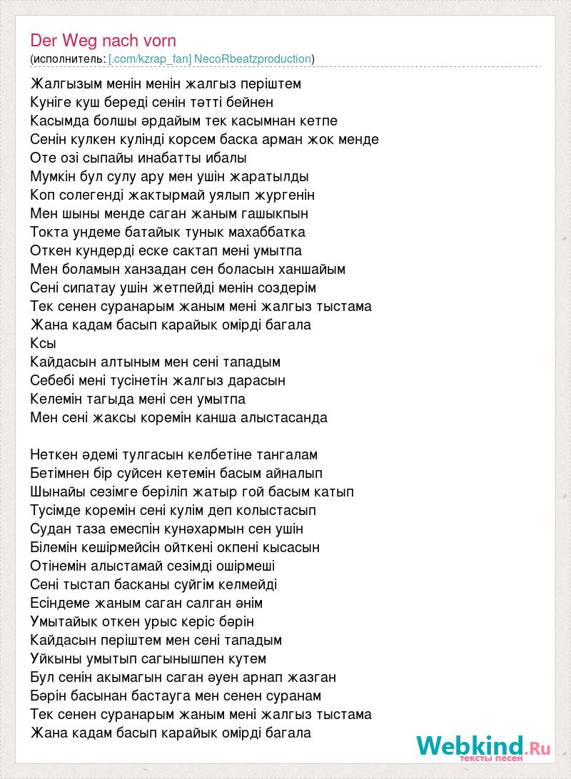 Жалгызым менін менін жалгыз періштем Куніге куш береді сенін тәтті бейнен Касымда болшы әрдайым тек касымнан кетпе Сенін кулкен кулінді корсем баска арман жок менде Оте озі сыпайы инабатты ибалы Мумкін бул сулу ару мен ушін жаратылды Коп солегенді жактырмай уялып жургенін Мен шыны менде саган жаным гашыкпын Токта ундеме батайык тунык махаббатка Откен кундерді еске сактап мені умытпа Мен боламын ханзадан сен боласын ханшайым Сені сипатау ушін жетпейді менін создерім Тек сенен суранарым жаным мені жалгыз тыстама Жана кадам басып карайык омірді багала Ксы Кайдасын алтыным мен сені тападым Себебі мені тусінетін жалгыз дарасын Келемін тагыда мені сен умытпа Мен сені жаксы коремін канша алыстасанда Неткен әдемі тулгасын келбетіне тангалам Бетімнен бір суйсен кетемін басым айналып Шынайы сезімге беріліп жатыр гой басым катып Тусімде коремін сені кулім деп колыстасып Судан таза емеспін кунәхармын сен ушін Білемін кешірмейсін ойткені окпені кысасын Отінемін алыстамай сезімді ошірмеші Сені тыстап басканы суйгім келмейді Есіндеме жаным саган салган әнім Умытайык откен урыс керіс бәрін Кайдасын періштем мен сені тападым Уйкыны умытып сагынышпен кутем Бул сенін акымагын саган әуен арнап жазган Бәрін басынан бастауга мен сенен суранам Тек сенен суранарым жаным мені жалгыз тыстама Жана кадам басып карайык омірді багала