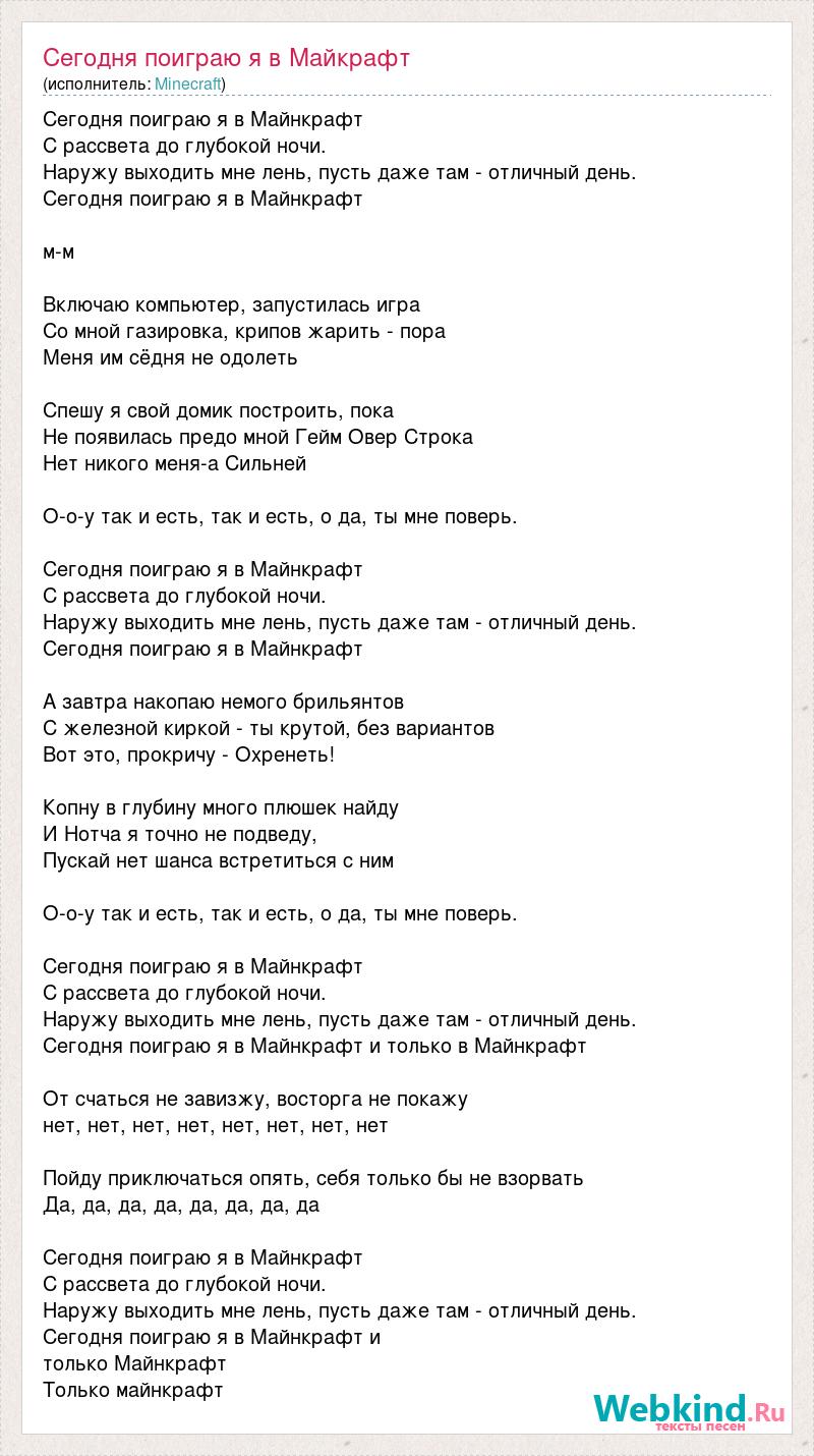 Сегодня поиграю я в Майнкрафт С рассвета до глубокой ночи. Наружу выходить мне лень, пусть даже там - отличный день. Сегодня поиграю я в Майнкрафт м-м Включаю компьютер, запустилась игра Со мной газировка, крипов жарить - пора Меня им сёдня не одолеть Спешу я свой домик построить, пока Не появилась предо мной Гейм Овер Строка Нет никого меня-а Сильней О-о-у так и есть, так и есть, о да, ты мне поверь. Сегодня поиграю я в Майнкрафт С рассвета до глубокой ночи. Наружу выходить мне лень, пусть даже там - отличный день. Сегодня поиграю я в Майнкрафт А завтра накопаю немого брильянтов С железной киркой - ты крутой, без вариантов Вот это, прокричу - Охренеть! Копну в глубину много плюшек найду И Нотча я точно не подведу, Пускай нет шанса встретиться с ним О-о-у так и есть, так и есть, о да, ты мне поверь. Сегодня поиграю я в Майнкрафт С рассвета до глубокой ночи. Наружу выходить мне лень, пусть даже там - отличный день. Сегодня поиграю я в Майнкрафт и только в Майнкрафт От счаться не завизжу, восторга не покажу нет, нет, нет, нет, нет, нет, нет, нет Пойду приключаться опять, себя только бы не взорвать Да, да, да, да, да, да, да, да Сегодня поиграю я в Майнкрафт С рассвета до глубокой ночи. Наружу выходить мне лень, пусть даже там - отличный день. Сегодня поиграю я в Майнкрафт и только Майнкрафт Только майнкрафт