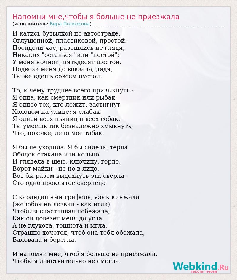 А как ты думаешь, о чем песня "Напомни мне,чтобы я больше не приезжала" ?