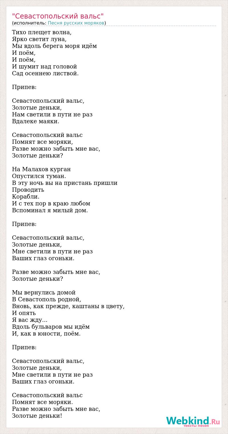 Тихо плещет волна, Ярко светит луна, Мы вдоль берега моря идём И поём, И поём, И шумит над головой Сад осеннею листвой. Припев: Севастопольский вальс, Золотые деньки, Нам светили в пути не раз Вдалеке маяки. Севастопольский вальс Помнят все моряки, Разве можно забыть мне вас, Золотые деньки? На Малахов курган Опустился туман. В эту ночь вы на пристань пришли Проводить Корабли. И с тех пор в краю любом Вспоминал я милый дом. Припев: Севастопольский вальс, Золотые деньки, Мне светили в пути не раз Ваших глаз огоньки. Разве можно забыть мне вас, Золотые деньки? Мы вернулись домой В Севастополь родной, Вновь, как прежде, каштаны в цвету, И опять Я вас жду... Вдоль бульваров мы идём И, как в юности, поём. Припев: Севастопольский вальс, Золотые деньки, Мне светили в пути не раз Ваших глаз огоньки. Севастопольский вальс Помнят все моряки. Разве можно забыть мне вас, Золотые деньки!