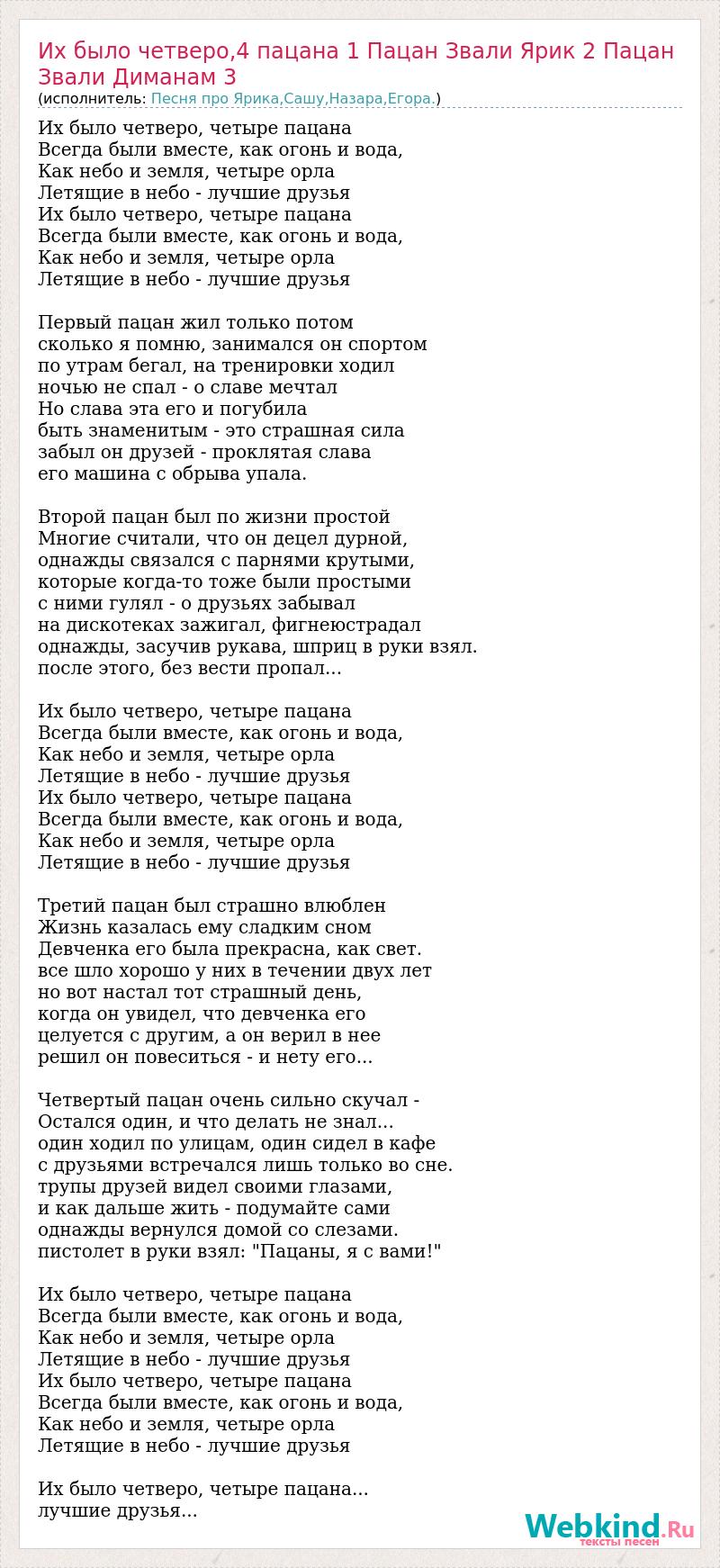 Главная→Исполнители→Песня про Ярика,Сашу,Назара,Егора.→Их было четверо,4 пацана 1 Пацан Звали Ярик 2 Пацан Звали Диманам 3