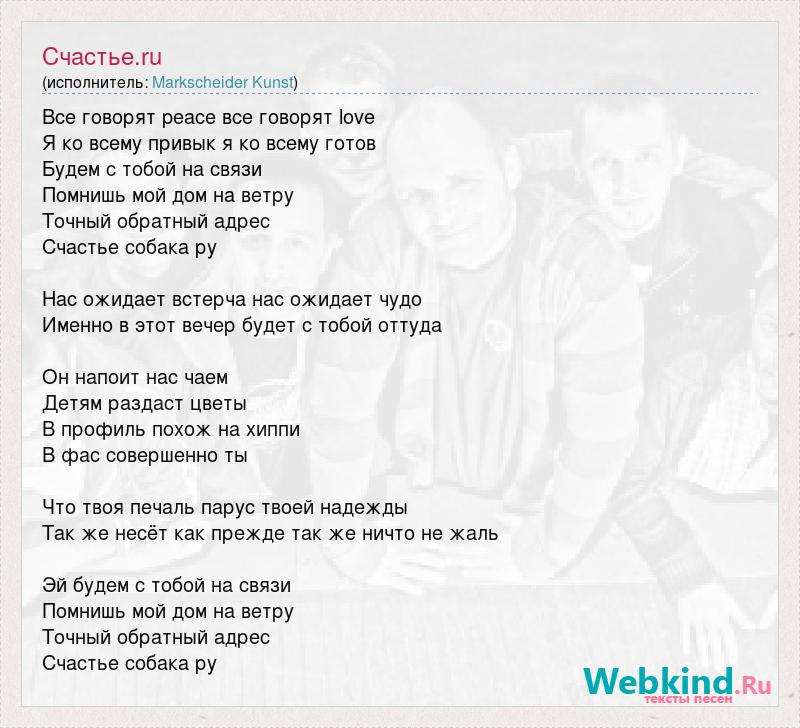 Все говорят peace все говорят love Я ко всему привык я ко всему готов Будем с тобой на связи Помнишь мой дом на ветру Точный обратный адрес Счастье собака ру Нас ожидает встерча нас ожидает чудо Именно в этот вечер будет с тобой оттуда Он напоит нас чаем Детям раздаст цветы В профиль похож на хиппи В фас совершенно ты Что твоя печаль парус твоей надежды Так же несёт как прежде так же ничто не жаль Эй будем с тобой на связи Помнишь мой дом на ветру Точный обратный адрес Счастье собака ру