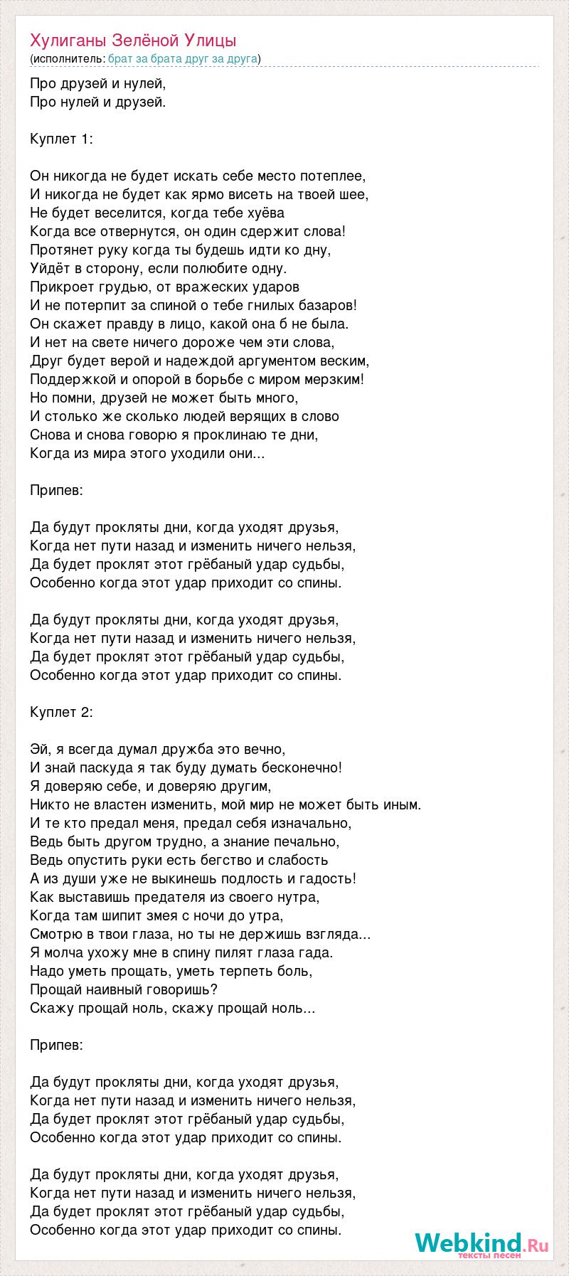 Про друзей и нулей, Про нулей и друзей. Куплет 1: Он никогда не будет искать себе место потеплее, И никогда не будет как ярмо висеть на твоей шее, Не будет веселится, когда тебе хуёва Когда все отвернутся, он один сдержит слова! Протянет руку когда ты будешь идти ко дну, Уйдёт в сторону, если полюбите одну. Прикроет грудью, от вражеских ударов И не потерпит за спиной о тебе гнилых базаров! Он скажет правду в лицо, какой она б не была. И нет на свете ничего дороже чем эти слова, Друг будет верой и надеждой аргументом веским, Поддержкой и опорой в борьбе с миром мерзким! Но помни, друзей не может быть много, И столько же сколько людей верящих в слово Снова и снова говорю я проклинаю те дни, Когда из мира этого уходили они... Припев: Да будут прокляты дни, когда уходят друзья, Когда нет пути назад и изменить ничего нельзя, Да будет проклят этот грёбаный удар судьбы, Особенно когда этот удар приходит со спины. Да будут прокляты дни, когда уходят друзья, Когда нет пути назад и изменить ничего нельзя, Да будет проклят этот грёбаный удар судьбы, Особенно когда этот удар приходит со спины. Куплет 2: Эй, я всегда думал дружба это вечно, И знай паскуда я так буду думать бесконечно! Я доверяю себе, и доверяю другим, Никто не властен изменить, мой мир не может быть иным. И те кто предал меня, предал себя изначально, Ведь быть другом трудно, а знание печально, Ведь опустить руки есть бегство и слабость А из души уже не выкинешь подлость и гадость! Как выставишь предателя из своего нутра, Когда там шипит змея с ночи до утра, Смотрю в твои глаза, но ты не держишь взгляда... Я молча ухожу мне в спину пилят глаза гада. Надо уметь прощать, уметь терпеть боль, Прощай наивный говоришь? Скажу прощай ноль, скажу прощай ноль... Припев: Да будут прокляты дни, когда уходят друзья, Когда нет пути назад и изменить ничего нельзя, Да будет проклят этот грёбаный удар судьбы, Особенно когда этот удар приходит со спины. Да будут прокляты дни, когда уходят друзья, Когда нет пути назад и изменить ничего нельзя, Да будет проклят этот грёбаный удар судьбы, Особенно когда этот удар приходит со спины.