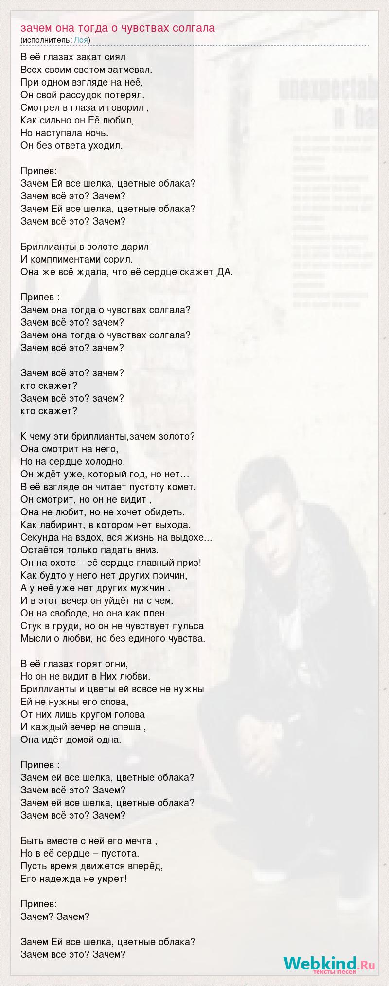 В её глазах закат сиял Всех своим светом затмевал. При одном взгляде на неё, Он свой рассудок потерял. Смотрел в глаза и говорил , Как сильно он Её любил, Но наступала ночь. Он без ответа уходил. Припев: Зачем Ей все шелка, цветные облака? Зачем всё это? Зачем? Зачем Ей все шелка, цветные облака? Зачем всё это? Зачем? Бриллианты в золоте дарил И комплиментами сорил. Она же всё ждала, что её сердце скажет ДА. Припев : Зачем она тогда о чувствах солгала? Зачем всё это? зачем? Зачем она тогда о чувствах солгала? Зачем всё это? зачем? Зачем всё это? зачем? кто скажет? Зачем всё это? зачем? кто скажет? К чему эти бриллианты,зачем золото? Она смотрит на него, Но на сердце холодно. Он ждёт уже, который год, но нет… В её взгляде он читает пустоту комет. Он смотрит, но он не видит , Она не любит, но не хочет обидеть. Как лабиринт, в котором нет выхода. Секунда на вздох, вся жизнь на выдохе... Остаётся только падать вниз. Он на охоте – её сердце главный приз! Как будто у него нет других причин, А у неё уже нет других мужчин . И в этот вечер он уйдёт ни с чем. Он на свободе, но она как плен. Стук в груди, но он не чувствует пульса Мысли о любви, но без единого чувства. В её глазах горят огни, Но он не видит в Них любви. Бриллианты и цветы ей вовсе не нужны Ей не нужны его слова, От них лишь кругом голова И каждый вечер не спеша , Она идёт домой одна. Припев : Зачем ей все шелка, цветные облака? Зачем всё это? Зачем? Зачем ей все шелка, цветные облака? Зачем всё это? Зачем? Быть вместе с ней его мечта , Но в её сердце – пустота. Пусть время движется вперёд, Его надежда не умрет! Припев: Зачем? Зачем? Зачем Ей все шелка, цветные облака? Зачем всё это? Зачем?