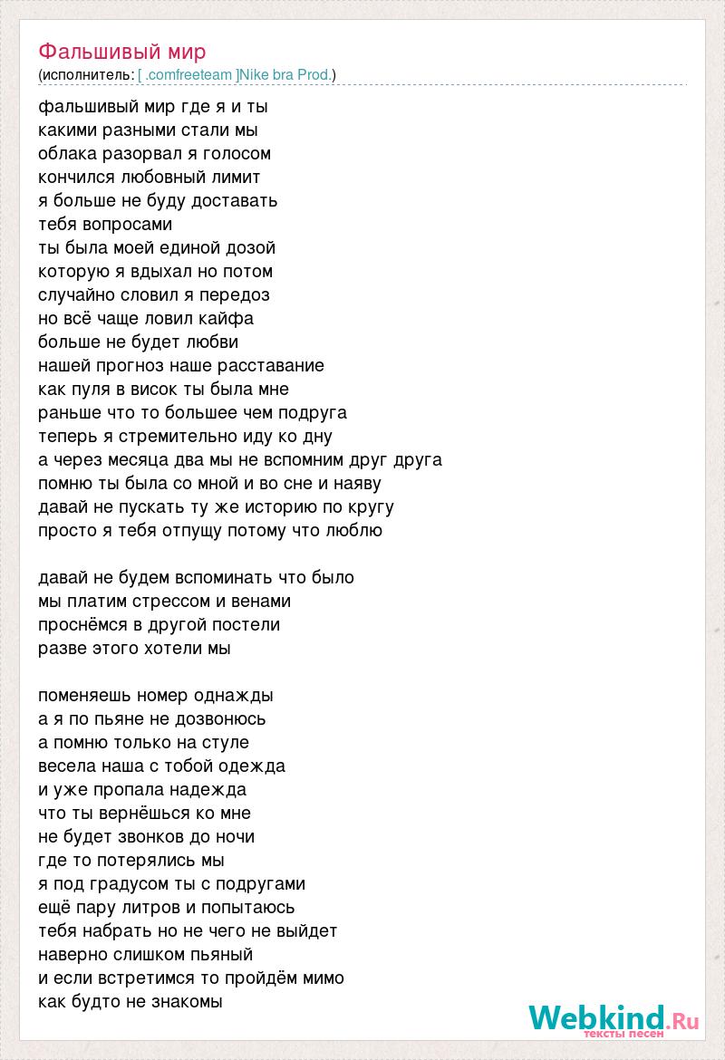 фальшивый мир где я и ты какими разными стали мы облака разорвал я голосом кончился любовный лимит я больше не буду доставать тебя вопросами ты была моей единой дозой которую я вдыхал но потом случайно словил я передоз но всё чаще ловил кайфа больше не будет любви нашей прогноз наше расставание как пуля в висок ты была мне раньше что то большее чем подруга теперь я стремительно иду ко дну а через месяца два мы не вспомним друг друга помню ты была со мной и во сне и наяву давай не пускать ту же историю по кругу просто я тебя отпущу потому что люблю давай не будем вспоминать что было мы платим стрессом и венами проснёмся в другой постели разве этого хотели мы поменяешь номер однажды а я по пьяне не дозвонюсь а помню только на стуле весела наша с тобой одежда и уже пропала надежда что ты вернёшься ко мне не будет звонков до ночи где то потерялись мы я под градусом ты с подругами ещё пару литров и попытаюсь тебя набрать но не чего не выйдет наверно слишком пьяный и если встретимся то пройдём мимо как будто не знакомы