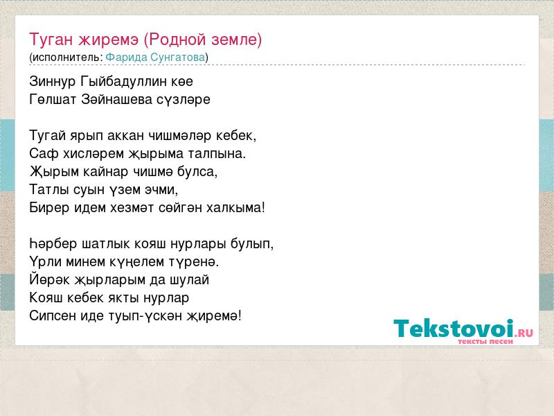 Зиннур Гыйбадуллин көе Гөлшат Зәйнашева сүзләре Тугай ярып аккан чишмәләр кебек, Саф хисләрем җырыма талпына. Җырым кайнар чишмә булса, Татлы суын үзем эчми, Бирер идем хезмәт сөйгән халкыма! Һәрбер шатлык кояш нурлары булып, Үрли минем күңелем түренә. Йөрәк җырларым да шулай Кояш кебек якты нурлар Сипсен иде туып-үскән җиремә!
