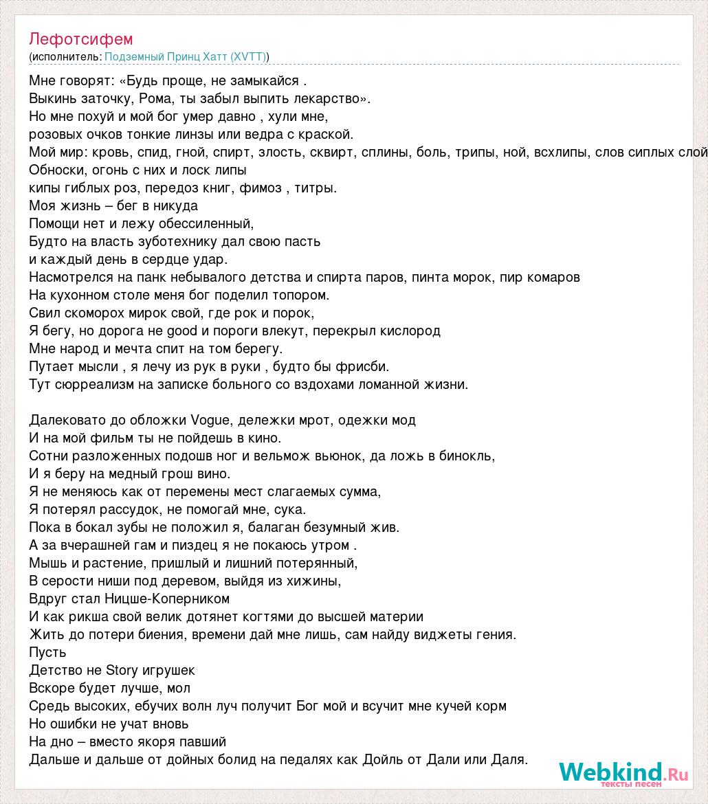 Мне говорят: «Будь проще, не замыкайся . Выкинь заточку, Рома, ты забыл выпить лекарство». Но мне похуй и мой бог умер давно , хули мне, розовых очков тонкие линзы или ведра с краской. Мой мир: кровь, спид, гной, спирт, злость, сквирт, сплины, боль, трипы, ной, всхлипы, слов сиплых слой Обноски, огонь с них и лоск липы кипы гиблых роз, передоз книг, фимоз , титры. Моя жизнь – бег в никуда Помощи нет и лежу обессиленный, Будто на власть зуботехнику дал свою пасть и каждый день в сердце удар. Насмотрелся на панк небывалого детства и спирта паров, пинта морок, пир комаров На кухонном столе меня бог поделил топором. Свил скоморох мирок свой, где рок и порок, Я бегу, но дорога не good и пороги влекут, перекрыл кислород Мне народ и мечта спит на том берегу. Путает мысли , я лечу из рук в руки , будто бы фрисби. Тут сюрреализм на записке больного со вздохами ломанной жизни. Далековато до обложки Vogue, дележки мрот, одежки мод И на мой фильм ты не пойдешь в кино. Сотни разложенных подошв ног и вельмож вьюнок, да ложь в бинокль, И я беру на медный грош вино. Я не меняюсь как от перемены мест слагаемых сумма, Я потерял рассудок, не помогай мне, сука. Пока в бокал зубы не положил я, балаган безумный жив. А за вчерашней гам и пиздец я не покаюсь утром . Мышь и растение, пришлый и лишний потерянный, В серости ниши под деревом, выйдя из хижины, Вдруг стал Ницше-Коперником И как рикша свой велик дотянет когтями до высшей материи Жить до потери биения, времени дай мне лишь, сам найду виджеты гения. Пусть Детство не Story игрушек Вскоре будет лучше, мол Средь высоких, ебучих волн луч получит Бог мой и всучит мне кучей корм Но ошибки не учат вновь На дно – вместо якоря павший Дальше и дальше от дойных болид на педалях как Дойль от Дали или Даля.