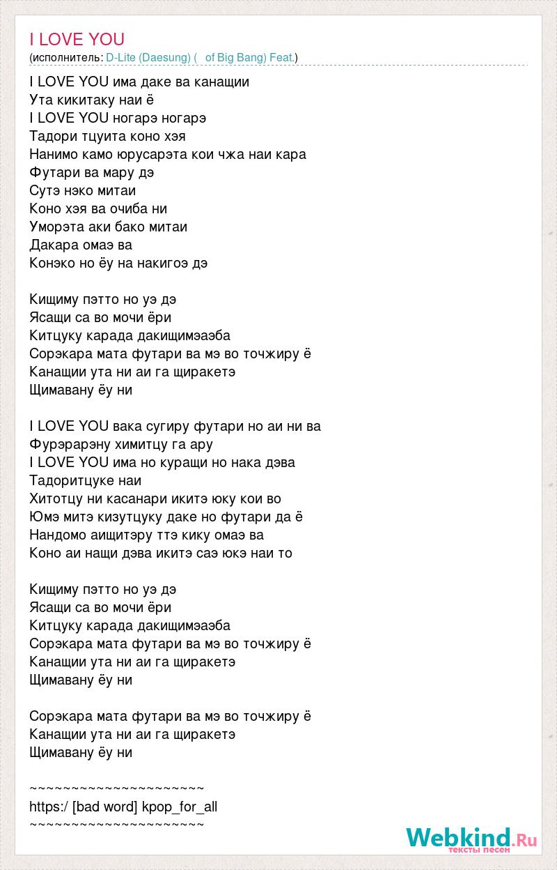 I LOVE YOU има даке ва канащии Ута кикитаку наи ё I LOVE YOU ногарэ ногарэ Тадори тцуита коно хэя Нанимо камо юрусарэта кои чжа наи кара Футари ва мару дэ Сутэ нэко митаи Коно хэя ва очиба ни Уморэта аки бако митаи Дакара омаэ ва Конэко но ёу на накигоэ дэ Кищиму пэтто но уэ дэ Ясащи са во мочи ёри Китцуку карада дакищимэаэба Сорэкара мата футари ва мэ во точжиру ё Канащии ута ни аи га щиракетэ Щимавану ёу ни I LOVE YOU вака сугиру футари но аи ни ва Фурэрарэну химитцу га ару I LOVE YOU има но куращи но нака дэва Тадоритцуке наи Хитотцу ни касанари икитэ юку кои во Юмэ митэ кизутцуку даке но футари да ё Нандомо аищитэру ттэ кику омаэ ва Коно аи нащи дэва икитэ саэ юкэ наи то Кищиму пэтто но уэ дэ Ясащи са во мочи ёри Китцуку карада дакищимэаэба Сорэкара мата футари ва мэ во точжиру ё Канащии ута ни аи га щиракетэ Щимавану ёу ни Сорэкара мата футари ва мэ во точжиру ё Канащии ута ни аи га щиракетэ Щимавану ёу ни ~~~~~~~~~~~~~~~~~~~~~ https:/ [bad word] kpop_for_all ~~~~~~~~~~~~~~~~~~~~~