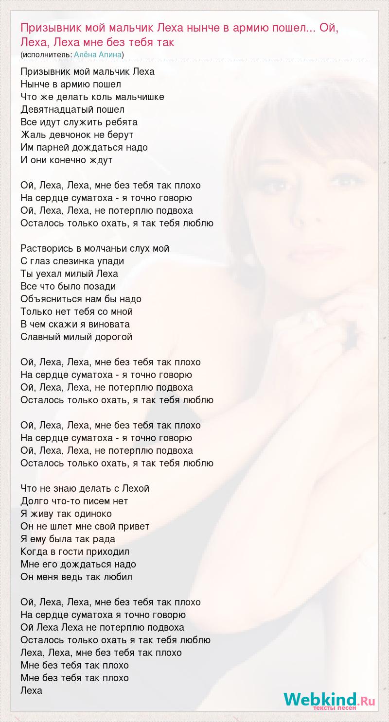 Призывник мой мальчик Леха Нынче в армию пошел Что же делать коль мальчишке Девятнадцатый пошел Все идут служить ребята Жаль девчонок не берут Им парней дождаться надо И они конечно ждут Ой, Леха, Леха, мне без тебя так плохо На сердце суматоха - я точно говорю Ой, Леха, Леха, не потерплю подвоха Осталось только охать, я так тебя люблю Растворись в молчаньи слух мой С глаз слезинка упади Ты уехал милый Леха Все что было позади Объясниться нам бы надо Только нет тебя со мной В чем скажи я виновата Славный милый дорогой Ой, Леха, Леха, мне без тебя так плохо На сердце суматоха - я точно говорю Ой, Леха, Леха, не потерплю подвоха Осталось только охать, я так тебя люблю Ой, Леха, Леха, мне без тебя так плохо На сердце суматоха - я точно говорю Ой, Леха, Леха, не потерплю подвоха Осталось только охать, я так тебя люблю Что не знаю делать с Лехой Долго что-то писем нет Я живу так одиноко Он не шлет мне свой привет Я ему была так рада Когда в гости приходил Мне его дождаться надо Он меня ведь так любил Ой, Леха, Леха, мне без тебя так плохо На сердце суматоха я точно говорю Ой Леха Леха не потерплю подвоха Осталось только охать я так тебя люблю Леха, Леха, мне без тебя так плохо Мне без тебя так плохо Мне без тебя так плохо Леха
