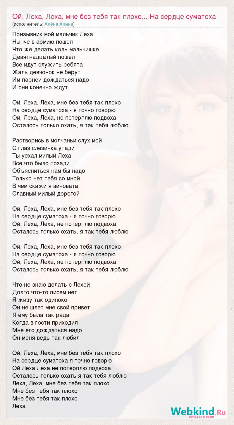 Призывник мой мальчик Леха Нынче в армию пошел Что же делать коль мальчишке Девятнадцатый пошел Все идут служить ребята Жаль девчонок не берут Им парней дождаться надо И они конечно ждут Ой, Леха, Леха, мне без тебя так плохо На сердце суматоха - я точно говорю Ой, Леха, Леха, не потерплю подвоха Осталось только охать, я так тебя люблю Растворись в молчаньи слух мой С глаз слезинка упади Ты уехал милый Леха Все что было позади Объясниться нам бы надо Только нет тебя со мной В чем скажи я виновата Славный милый дорогой Ой, Леха, Леха, мне без тебя так плохо На сердце суматоха - я точно говорю Ой, Леха, Леха, не потерплю подвоха Осталось только охать, я так тебя люблю Ой, Леха, Леха, мне без тебя так плохо На сердце суматоха - я точно говорю Ой, Леха, Леха, не потерплю подвоха Осталось только охать, я так тебя люблю Что не знаю делать с Лехой Долго что-то писем нет Я живу так одиноко Он не шлет мне свой привет Я ему была так рада Когда в гости приходил Мне его дождаться надо Он меня ведь так любил Ой, Леха, Леха, мне без тебя так плохо На сердце суматоха я точно говорю Ой Леха Леха не потерплю подвоха Осталось только охать я так тебя люблю Леха, Леха, мне без тебя так плохо Мне без тебя так плохо Мне без тебя так плохо Леха