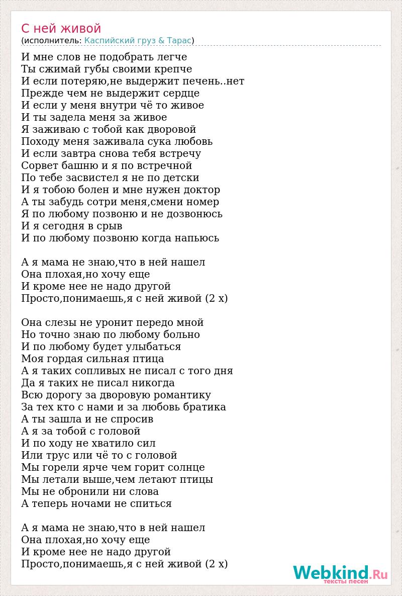 И мне слов не подобрать легче Ты сжимай губы своими крепче И если потеряю,не выдержит печень..нет Прежде чем не выдержит сердце И если у меня внутри чё то живое И ты задела меня за живое Я заживаю с тобой как дворовой Походу меня заживала сука любовь И если завтра снова тебя встречу Сорвет башню и я по встречной По тебе засвистел я не по детски И я тобою болен и мне нужен доктор А ты забудь сотри меня,смени номер Я по любому позвоню и не дозвонюсь И я сегодня в срыв И по любому позвоню когда напьюсь А я мама не знаю,что в ней нашел Она плохая,но хочу еще И кроме нее не надо другой Просто,понимаешь,я с ней живой (2 х) Она слезы не уронит передо мной Но точно знаю по любому больно И по любому будет улыбаться Моя гордая сильная птица А я таких сопливых не писал с того дня Да я таких не писал никогда Всю дорогу за дворовую романтику За тех кто с нами и за любовь братика А ты зашла и не спросив А я за тобой с головой И по ходу не хватило сил Или трус или чё то с головой Мы горели ярче чем горит солнце Мы летали выше,чем летают птицы Мы не обронили ни слова А теперь ночами не спиться А я мама не знаю,что в ней нашел Она плохая,но хочу еще И кроме нее не надо другой Просто,понимаешь,я с ней живой (2 х)