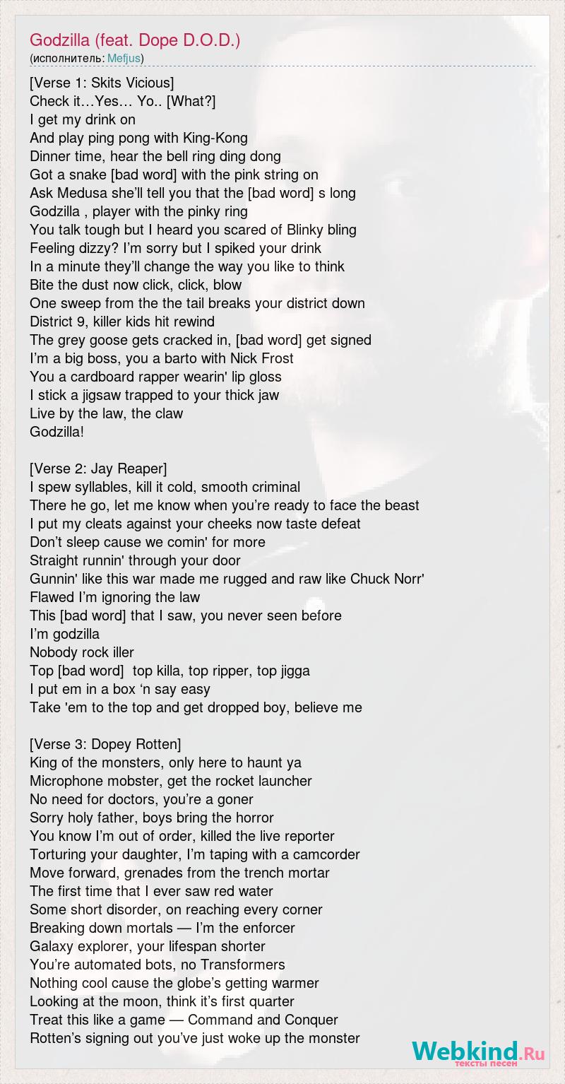 [Verse 1: Skits Vicious] Check it…Yes… Yo.. [What?] I get my drink on And play ping pong with King-Kong Dinner time, hear the bell ring ding dong Got a snake [bad word] with the pink string on Ask Medusa she’ll tell you that the [bad word] s long Godzilla , player with the pinky ring You talk tough but I heard you scared of Blinky bling Feeling dizzy? I’m sorry but I spiked your drink In a minute they’ll change the way you like to think Bite the dust now click, click, blow One sweep from the the tail breaks your district down District 9, killer kids hit rewind The grey goose gets cracked in, [bad word] get signed I’m a big boss, you a barto with Nick Frost You a cardboard rapper wearin' lip gloss I stick a jigsaw trapped to your thick jaw Live by the law, the claw Godzilla! [Verse 2: Jay Reaper] I spew syllables, kill it cold, smooth criminal There he go, let me know when you’re ready to face the beast I put my cleats against your cheeks now taste defeat Don’t sleep cause we comin' for more Straight runnin' through your door Gunnin' like this war made me rugged and raw like Chuck Norr' Flawed I’m ignoring the law This [bad word] that I saw, you never seen before I’m godzilla Nobody rock iller Top [bad word] top killa, top ripper, top jigga I put em in a box ‘n say easy Take 'em to the top and get dropped boy, believe me [Verse 3: Dopey Rotten] King of the monsters, only here to haunt ya Microphone mobster, get the rocket launcher No need for doctors, you’re a goner Sorry holy father, boys bring the horror You know I’m out of order, killed the live reporter Torturing your daughter, I’m taping with a camcorder Move forward, grenades from the trench mortar The first time that I ever saw red water Some short disorder, on reaching every corner Breaking down mortals — I’m the enforcer Galaxy explorer, your lifespan shorter You’re automated bots, no Transformers Nothing cool cause the globe’s getting warmer Looking at the moon, think it’s first quarter Treat this like a game — Command and Conquer Rotten’s signing out you’ve just woke up the monster