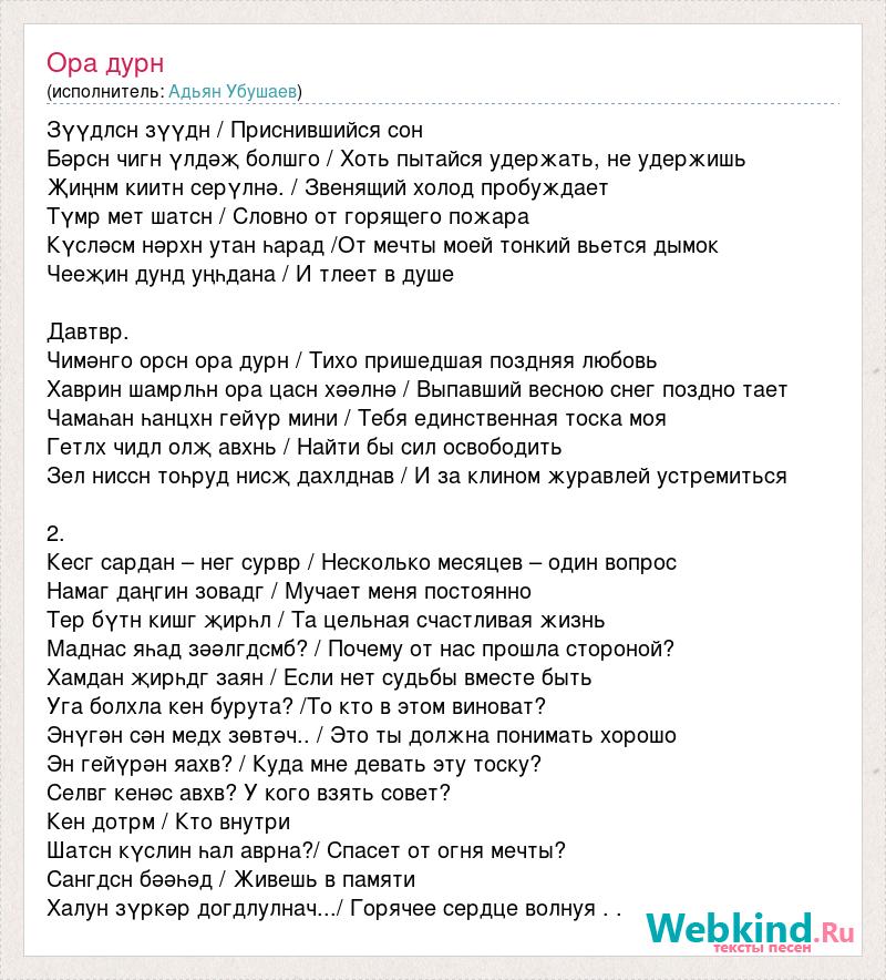 Зүүдлсн зүүдн / Приснившийся сон Бәрсн чигн үлдәҗ болшго / Хоть пытайся удержать, не удержишь Җиңнм киитн серүлнә. / Звенящий холод пробуждает Түмр мет шатсн / Словно от горящего пожара Күсләсм нәрхн утан һарад /От мечты моей тонкий вьется дымок Чееҗин дунд уңһдана / И тлеет в душе Давтвр. Чимәнго орсн ора дурн / Тихо пришедшая поздняя любовь Хаврин шамрлһн ора цасн хәәлнә / Выпавший весною снег поздно тает Чамаһан һанцхн гейүр мини / Тебя единственная тоска моя Гетлх чидл олҗ авхнь / Найти бы сил освободить Зел ниссн тоһруд нисҗ дахлднав / И за клином журавлей устремиться 2. Кесг сардан – нег сурвр / Несколько месяцев – один вопрос Намаг даңгин зовадг / Мучает меня постоянно Тер бүтн кишг җирһл / Та цельная счастливая жизнь Маднас яһад зәәлгдсмб? / Почему от нас прошла стороной? Хамдан җирһдг заян / Если нет судьбы вместе быть Уга болхла кен бурута? /То кто в этом виноват? Энүгән сән медх зөвтәч.. / Это ты должна понимать хорошо Эн гейүрән яахв? / Куда мне девать эту тоску? Селвг кенәс авхв? У кого взять совет? Кен дотрм / Кто внутри Шатсн күслин һал аврна?/ Спасет от огня мечты? Сангдсн бәәһәд / Живешь в памяти Халун зүркәр догдлулнач.../ Горячее сердце волнуя . .