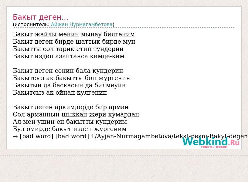 Бакыт жайлы менин мынау билгеним Бакыт деген бирде шаттык бирде мун Бакытты сол тарик етип тундерин Бакыт издеп азаптанса кимде-ким Бакыт деген сенин бала кундерин Бакытсыз ак бакытты боп жургенин Бакытын да баскасын да билмеуин Бакытсыз ак ойнап кулгенин Бакыт деген аркимдерде бир арман Сол арманнын шыккан жери кумардан Ал мен ушин ен бакытты кундерим Бул омирде бакыт издеп жургеним → [bad word] [bad word] 1/Ayjan-Nurmagambetova/tekst-pesni-Bakyt-degen