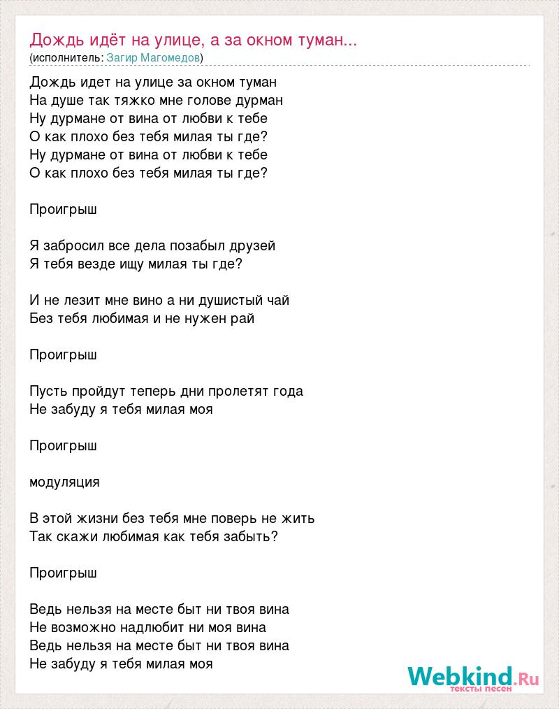 Дождь идет на улице за окном туман На душе так тяжко мне голове дурман Ну дурмане от вина от любви к тебе О как плохо без тебя милая ты где? Ну дурмане от вина от любви к тебе О как плохо без тебя милая ты где? Проигрыш Я забросил все дела позабыл друзей Я тебя везде ищу милая ты где? И не лезит мне вино а ни душистый чай Без тебя любимая и не нужен рай Проигрыш Пусть пройдут теперь дни пролетят года Не забуду я тебя милая моя Проигрыш модуляция В этой жизни без тебя мне поверь не жить Так скажи любимая как тебя забыть? Проигрыш Ведь нельзя на месте быт ни твоя вина Не возможно надлюбит ни моя вина Ведь нельзя на месте быт ни твоя вина Не забуду я тебя милая моя