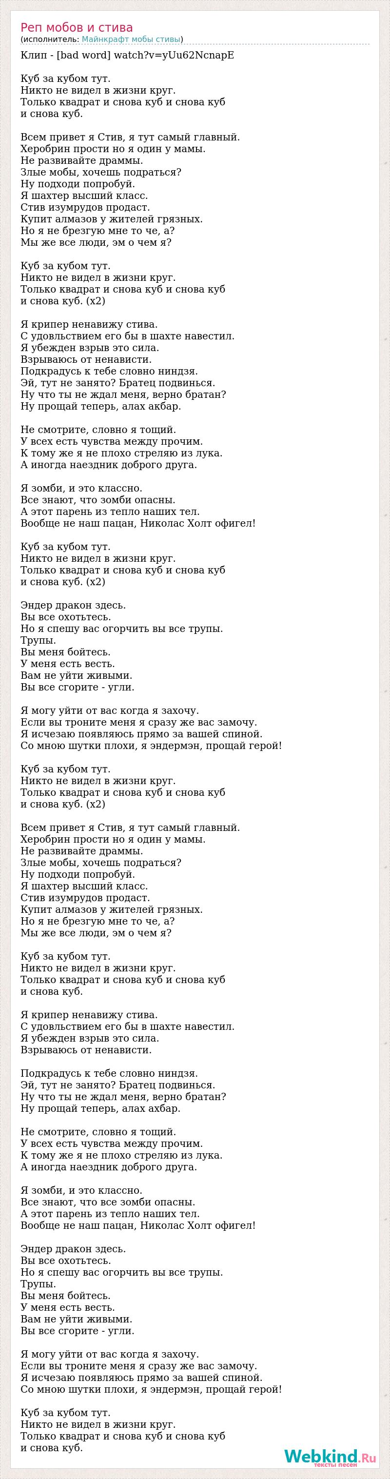 Клип - [bad word] watch?v=yUu62NcnapE Куб за кубом тут. Никто не видел в жизни круг. Только квадрат и снова куб и снова куб и снова куб. Всем привет я Стив, я тут самый главный. Херобрин прости но я один у мамы. Не развивайте драммы. Злые мобы, хочешь подраться? Ну подходи попробуй. Я шахтер высший класс. Стив изумрудов продаст. Купит алмазов у жителей грязных. Но я не брезгую мне то че, а? Мы же все люди, эм о чем я? Куб за кубом тут. Никто не видел в жизни круг. Только квадрат и снова куб и снова куб и снова куб. (х2) Я крипер ненавижу стива. С удовльствием его бы в шахте навестил. Я убежден взрыв это сила. Взрываюсь от ненависти. Подкрадусь к тебе словно ниндзя. Эй, тут не занято? Братец подвинься. Ну что ты не ждал меня, верно братан? Ну прощай теперь, алах акбар. Не смотрите, словно я тощий. У всех есть чувства между прочим. К тому же я не плохо стреляю из лука. А иногда наездник доброго друга. Я зомби, и это классно. Все знают, что зомби опасны. А этот парень из тепло наших тел. Вообще не наш пацан, Николас Холт офигел! Куб за кубом тут. Никто не видел в жизни круг. Только квадрат и снова куб и снова куб и снова куб. (х2) Эндер дракон здесь. Вы все охотьтесь. Но я спешу вас огорчить вы все трупы. Трупы. Вы меня бойтесь. У меня есть весть. Вам не уйти живыми. Вы все сгорите - угли. Я могу уйти от вас когда я захочу. Если вы троните меня я сразу же вас замочу. Я исчезаю появляюсь прямо за вашей спиной. Со мною шутки плохи, я эндермэн, прощай герой! Куб за кубом тут. Никто не видел в жизни круг. Только квадрат и снова куб и снова куб и снова куб. (х2) Всем привет я Стив, я тут самый главный. Херобрин прости но я один у мамы. Не развивайте драммы. Злые мобы, хочешь подраться? Ну подходи попробуй. Я шахтер высший класс. Стив изумрудов продаст. Купит алмазов у жителей грязных. Но я не брезгую мне то че, а? Мы же все люди, эм о чем я? Куб за кубом тут. Никто не видел в жизни круг. Только квадрат и снова куб и снова куб и снова куб. Я крипер ненавижу стива. С удовльствием его бы в шахте навестил. Я убежден взрыв это сила. Взрываюсь от ненависти. Подкрадусь к тебе словно ниндзя. Эй, тут не занято? Братец подвинься. Ну что ты не ждал меня, верно братан? Ну прощай теперь, алах ахбар. Не смотрите, словно я тощий. У всех есть чувства между прочим. К тому же я не плохо стреляю из лука. А иногда наездник доброго друга. Я зомби, и это классно. Все знают, что все зомби опасны. А этот парень из тепло наших тел. Вообще не наш пацан, Николас Холт офигел! Эндер дракон здесь. Вы все охотьтесь. Но я спешу вас огорчить вы все трупы. Трупы. Вы меня бойтесь. У меня есть весть. Вам не уйти живыми. Вы все сгорите - угли. Я могу уйти от вас когда я захочу. Если вы троните меня я сразу же вас замочу. Я исчезаю появляюсь прямо за вашей спиной. Со мною шутки плохи, я эндермэн, прощай герой! Куб за кубом тут. Никто не видел в жизни круг. Только квадрат и снова куб и снова куб и снова куб.