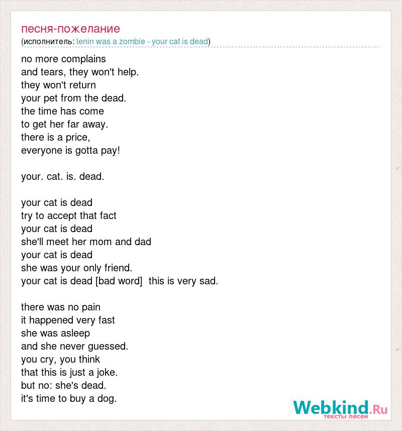 no more complains and tears, they won't help. they won't return your pet from the dead. the time has come to get her far away. there is a price, everyone is gotta pay! your. cat. is. dead. your cat is dead try to accept that fact your cat is dead she'll meet her mom and dad your cat is dead she was your only friend. your cat is dead [bad word] this is very sad. there was no pain it happened very fast she was asleep and she never guessed. you cry, you think that this is just a joke. but no: she's dead. it's time to buy a dog.