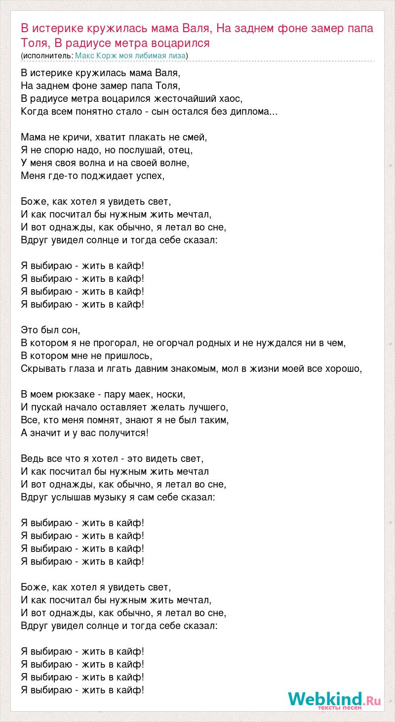 В истерике кружилась мама Валя, На заднем фоне замер папа Толя, В радиусе метра воцарился жесточайший хаос, Когда всем понятно стало - сын остался без диплома... Мама не кричи, хватит плакать не смей, Я не спорю надо, но послушай, отец, У меня своя волна и на своей волне, Меня где-то поджидает успех, Боже, как хотел я увидеть свет, И как посчитал бы нужным жить мечтал, И вот однажды, как обычно, я летал во сне, Вдруг увидел солнце и тогда себе сказал: Я выбираю - жить в кайф! Я выбираю - жить в кайф! Я выбираю - жить в кайф! Я выбираю - жить в кайф! Это был сон, В котором я не прогорал, не огорчал родных и не нуждался ни в чем, В котором мне не пришлось, Скрывать глаза и лгать давним знакомым, мол в жизни моей все хорошо, В моем рюкзаке - пару маек, носки, И пускай начало оставляет желать лучшего, Все, кто меня помнят, знают я не был таким, А значит и у вас получится! Ведь все что я хотел - это видеть свет, И как посчитал бы нужным жить мечтал И вот однажды, как обычно, я летал во сне, Вдруг услышав музыку я сам себе сказал: Я выбираю - жить в кайф! Я выбираю - жить в кайф! Я выбираю - жить в кайф! Я выбираю - жить в кайф! Боже, как хотел я увидеть свет, И как посчитал бы нужным жить мечтал, И вот однажды, как обычно, я летал во сне, Вдруг увидел солнце и тогда себе сказал: Я выбираю - жить в кайф! Я выбираю - жить в кайф! Я выбираю - жить в кайф! Я выбираю - жить в кайф!