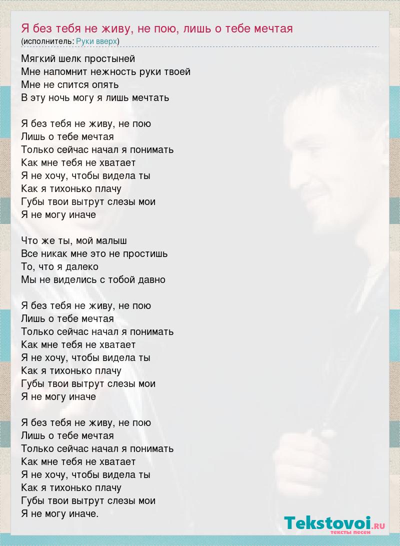 Мягкий шелк простыней Мне напомнит нежность руки твоей Мне не спится опять В эту ночь могу я лишь мечтать Я без тебя не живу, не пою Лишь о тебе мечтая Только сейчас начал я понимать Как мне тебя не хватает Я не хочу, чтобы видела ты Как я тихонько плачу Губы твои вытрут слезы мои Я не могу иначе Что же ты, мой малыш Все никак мне это не простишь То, что я далеко Мы не виделись с тобой давно Я без тебя не живу, не пою Лишь о тебе мечтая Только сейчас начал я понимать Как мне тебя не хватает Я не хочу, чтобы видела ты Как я тихонько плачу Губы твои вытрут слезы мои Я не могу иначе Я без тебя не живу, не пою Лишь о тебе мечтая Только сейчас начал я понимать Как мне тебя не хватает Я не хочу, чтобы видела ты Как я тихонько плачу Губы твои вытрут слезы мои Я не могу иначе.