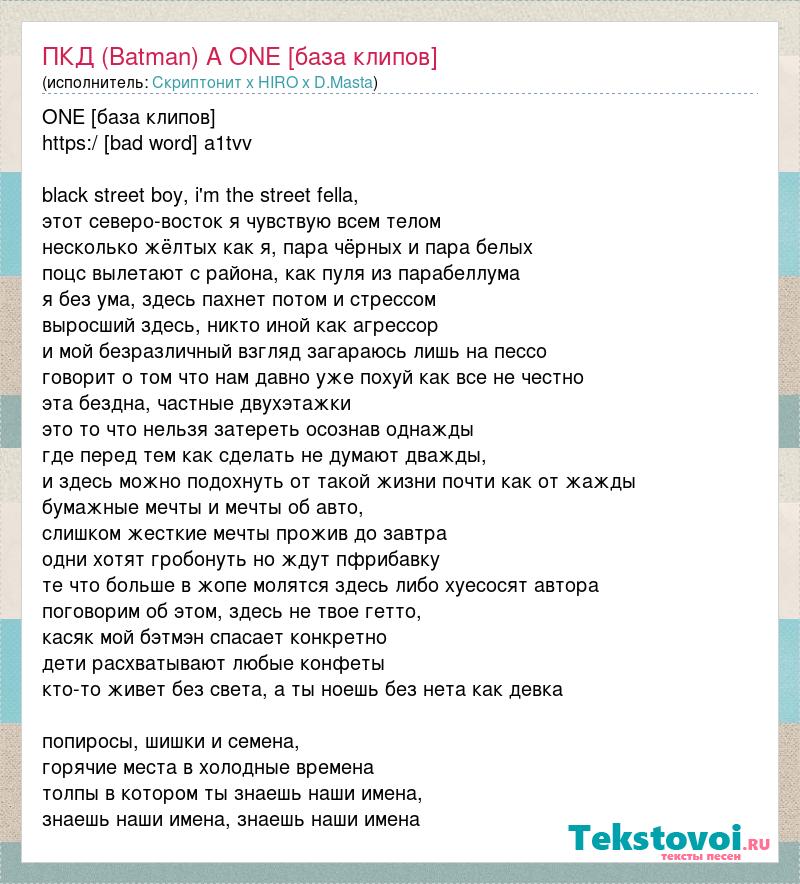 ONE [база клипов] https:/ [bad word] a1tvv black street boy, i'm the street fella, этот северо-восток я чувствую всем телом несколько жёлтых как я, пара чёрных и пара белых поцс вылетают с района, как пуля из парабеллума я без ума, здесь пахнет потом и стрессом выросший здесь, никто иной как агрессор и мой безразличный взгляд загараюсь лишь на пессо говорит о том что нам давно уже похуй как все не честно эта бездна, частные двухэтажки это то что нельзя затереть осознав однажды где перед тем как сделать не думают дважды, и здесь можно подохнуть от такой жизни почти как от жажды бумажные мечты и мечты об авто, слишком жесткие мечты прожив до завтра одни хотят гробонуть но ждут пфрибавку те что больше в жопе молятся здесь либо хуесосят автора поговорим об этом, здесь не твое гетто, касяк мой бэтмэн спасает конкретно дети расхватывают любые конфеты кто-то живет без света, а ты ноешь без нета как девка попиросы, шишки и семена, горячие места в холодные времена толпы в котором ты знаешь наши имена, знаешь наши имена, знаешь наши имена