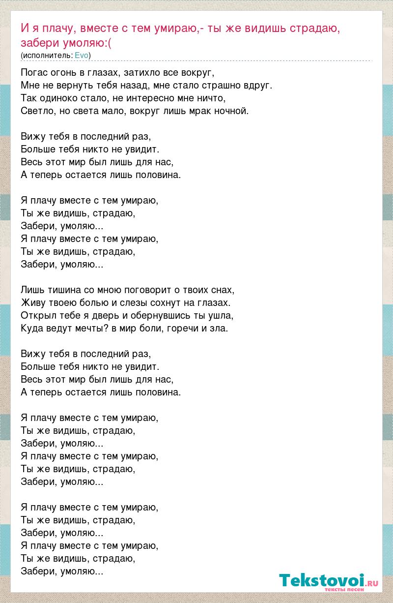 Погас огонь в глазах, затихло все вокруг, Мне не вернуть тебя назад, мне стало страшно вдруг. Так одиноко стало, не интересно мне ничто, Светло, но света мало, вокруг лишь мрак ночной. Вижу тебя в последний раз, Больше тебя никто не увидит. Весь этот мир был лишь для нас, А теперь остается лишь половина. Я плачу вместе с тем умираю, Ты же видишь, страдаю, Забери, умоляю... Я плачу вместе с тем умираю, Ты же видишь, страдаю, Забери, умоляю... Лишь тишина со мною поговорит о твоих снах, Живу твоею болью и слезы сохнут на глазах. Открыл тебе я дверь и обернувшись ты ушла, Куда ведут мечты? в мир боли, горечи и зла. Вижу тебя в последний раз, Больше тебя никто не увидит. Весь этот мир был лишь для нас, А теперь остается лишь половина. Я плачу вместе с тем умираю, Ты же видишь, страдаю, Забери, умоляю... Я плачу вместе с тем умираю, Ты же видишь, страдаю, Забери, умоляю... Я плачу вместе с тем умираю, Ты же видишь, страдаю, Забери, умоляю... Я плачу вместе с тем умираю, Ты же видишь, страдаю, Забери, умоляю...