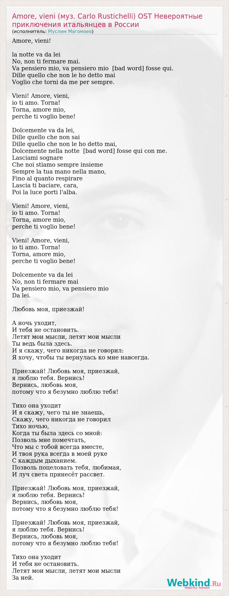 Amore, vieni! la notte va da lei No, non ti fermare mai. Va pensiero mio, va pensiero mio [bad word] fosse qui. Dille quello che non le ho detto mai Voglio che torni da me per sempre. Vieni! Amore, vieni, io ti amo. Torna! Torna, amore mio, perche ti voglio bene! Dolcemente va da lei, Dille quello che non sai Dille quello che non le ho detto mai, Dolcemente nella notte [bad word] fosse qui con me. Lasciami sognare Che noi stiamo sempre insieme Sempre la tua mano nella mano, Fino al quanto respirare Lascia ti baciare, cara, Poi la luce porti l'alba. Vieni! Amore, vieni, io ti amo. Torna! Torna, amore mio, perche ti voglio bene! Vieni! Amore, vieni, io ti amo. Torna! Torna, amore mio, perche ti voglio bene! Dolcemente va da lei No, non ti fermare mai Va pensiero mio, va pensiero mio Da lei. Любовь моя, приезжай! А ночь уходит, И тебя не остановить. Летят мои мысли, летят мои мысли Ты ведь была здесь. И я скажу, чего никогда не говорил: Я хочу, чтобы ты вернулась ко мне навсегда. Приезжай! Любовь моя, приезжай, я люблю тебя. Вернись! Вернись, любовь моя, потому что я безумно люблю тебя! Тихо она уходит И я скажу, чего ты не знаешь, Скажу, чего никогда не говорил Тихо ночью, Когда ты была здесь со мной: Позволь мне помечтать, Что мы с тобой всегда вместе, И твоя рука всегда в моей руке С каждым дыханием. Позволь поцеловать тебя, любимая, И луч света принесёт рассвет. Приезжай! Любовь моя, приезжай, я люблю тебя. Вернись! Вернись, любовь моя, потому что я безумно люблю тебя! Приезжай! Любовь моя, приезжай, я люблю тебя. Вернись! Вернись, любовь моя, потому что я безумно люблю тебя! Тихо она уходит И тебя не остановить. Летят мои мысли, летят мои мысли За ней.