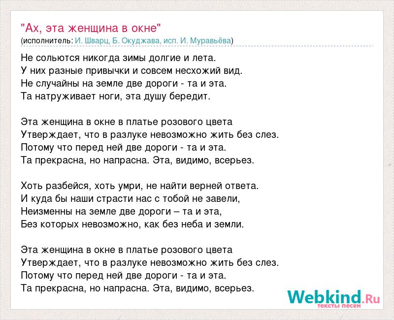Не сольются никогда зимы долгие и лета. У них разные привычки и совсем несхожий вид. Не случайны на земле две дороги - та и эта. Та натруживает ноги, эта душу бередит. Эта женщина в окне в платье розового цвета Утверждает, что в разлуке невозможно жить без слез. Потому что перед ней две дороги - та и эта. Та прекрасна, но напрасна. Эта, видимо, всерьез. Хоть разбейся, хоть умри, не найти верней ответа. И куда бы наши страсти нас с тобой не завели, Неизменны на земле две дороги – та и эта, Без которых невозможно, как без неба и земли. Эта женщина в окне в платье розового цвета Утверждает, что в разлуке невозможно жить без слез. Потому что перед ней две дороги - та и эта. Та прекрасна, но напрасна. Эта, видимо, всерьез.