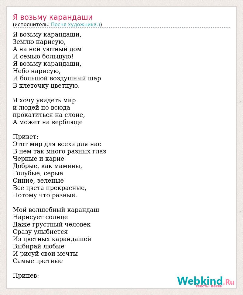 Я возьму карандаши, Землю нарисую, А на ней уютный дом И семью большую! Я возьму карандаши, Небо нарисую, И большой воздушный шар В клеточку цветную. Я хочу увидеть мир и людей по всюда прокатиться на слоне, А может на верблюде Привет: Этот мир для всехз для нас В нем так много разных глаз Черные и карие Добрые, как мамины, Голубые, серые Синие, зеленые Все цвета прекрасные, Потому что разные. Мой волшебный карандаш Нарисует солнце Даже грустный человек Сразу улыбнется Из цветных карандашей Выбирай любые И рисуй свои мечты Самые цветные Припев: