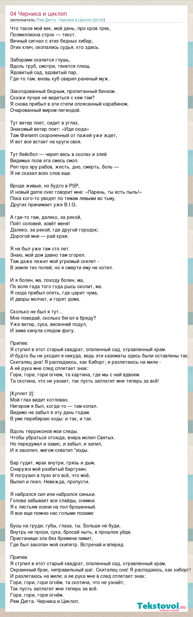 Что такое мой век, мой день, про кров трек, Полмиллиона строк — текст. Вечный сигнал с этих бедных хибар, Этих клич, окопались судья, кто здесь. Заборами скалится глушь, Вдоль труб, смотри, тянется плющ. Ядовитый сад, ядовитый пар, Где-то там, вновь куб сварил раненый муж. Заколдованный бедным, пропитанный бензом. Скажи лучше не видеться с кем там? Я снова прибыл в эти степи опоясанный карабином, Очарованный миром-легендой. Тут ветер поет, сидит в углах, Знакомый ветер поет: «Иди сюда» Там Филипп схороненный от пажей уже ждет, И вот все встает на круги своя. Тут бейсбол — череп весь в сколах и злей Видимых псов эта смесь смол. Реп про эру рабов, жесть, дно, смерть, боль — Я не сказал всех слов еще. Вроде живые, но будто в PSP, И новый game over говорит мне: «Парень, ты есть пыль!» Пока кого-то уводят по темам левыми во тьму, Других принимает уже B.I.G. А где-то там, далеко, за рекой, Поёт соловей, зовёт меня! Далеко, за рекой, где другой городок; Дорогой мне — рай края. Я не был уже там сто лет. Знаю, мой дом давно там сгорел. Там даже лежит мой угрюмый скелет - В земле тех полей, но я смерти ему не хотел. И я болен, ма, походу болен, ма, По воле гада того года рысь околит, ма. Я сюда прибыл опять, где царит чума, И дворы молчат, и горят дома. Сколько не был я тут... Мне поведай, сколько бегал в бреду? Уже ветер, сука, весенний подул, И зима кинула следом фату. Припев: Я ступил в этот старый квадрат, опаленный сад, отравленный храм. И будто бы не уходил я никуда, ведь эти казематы здесь были оставлены так. Скиталец дна! Я распадаюсь, как Киборг; и разлетаюсь на мили - А её рука мне след сплетает знак: Гори, гори, гори огнем, та картина, где мы с ней вдвоем. Та скотина, что не узнает, так пусть заплатит мне теперь за всё! [Куплет 2]: Мой глаз видит котлован, Нигером я был, когда-то — там копал. Видимо не забыл я эту дань годам. В уме перебираю ходы: и так, и так. Вдоль терриконов мои следы. Чтобы убраться отсюда, вчера молил Святых. Но передумал и завис, и забыл, и запил, И я засопел, мигом схватил *изды. Бар гудит, мрак внутри, грязь и дым, Снаружи мой разбитый баргузин. Я погрузил в пузо его всё, что моё, Выпил и поел. Невежда, пропусти. Я набрался сил или набрался синьки. Голова забывает все слайды, снимки. Я к листьям осени на пол брошенный. Я все еще помню нас голыми позами: Бусы на груди, губы, глаза, ты. Больше не буди, Внутрь не проси, сука, бросай ныть, в прошлое уйди. Пристанище зла без бремени лимит, Где был закопан мой скипетр. Встречай и вперед. Припев: Я ступил в этот старый квадрат, опаленный сад, отравленный храм, Окраинный брак, неправильный шаг. Скиталец сна! Я распадаюсь, как киборг! И разлетаюсь на мили; а ее рука мне в след сплетает знак: Гори, гори, гори огнём, та скотина, что не узнаёт, Так пусть заплатит мне теперь за всё. Гори, гори, гори огнём. Рем Дигга. Черника и Циклоп.