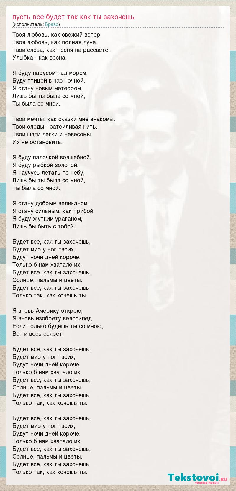 Твоя любовь, как свежий ветер, Твоя любовь, как полная луна, Твои слова, как песня на рассвете, Улыбка - как весна. Я буду парусом над морем, Буду птицей в час ночной. Я стану новым метеором. Лишь бы ты была со мной, Ты была со мной. Твои мечты, как сказки мне знакомы. Твои следы - затейливая нить. Твои шаги легки и невесомы Их не остановить. Я буду палочкой волшебной, Я буду рыбкой золотой, Я научусь летать по небу, Лишь бы ты была со мной, Ты была со мной. Я стану добрым великаном. Я стану сильным, как прибой. Я буду жутким ураганом, Лишь бы быть с тобой. Будет все, как ты захочешь, Будет мир у ног твоих, Будут ночи дней короче, Только б нам хватало их. Будет все, как ты захочешь, Солнце, пальмы и цветы. Будет все, как ты захочешь Только так, как хочешь ты. Я вновь Америку открою, Я вновь изобрету велосипед. Если только будешь ты со мною, Вот и весь секрет. Будет все, как ты захочешь, Будет мир у ног твоих, Будут ночи дней короче, Только б нам хватало их. Будет все, как ты захочешь, Солнце, пальмы и цветы. Будет все, как ты захочешь Только так, как хочешь ты. Будет все, как ты захочешь, Будет мир у ног твоих, Будут ночи дней короче, Только б нам хватало их. Будет все, как ты захочешь, Солнце, пальмы и цветы. Будет все, как ты захочешь Только так, как хочешь ты.