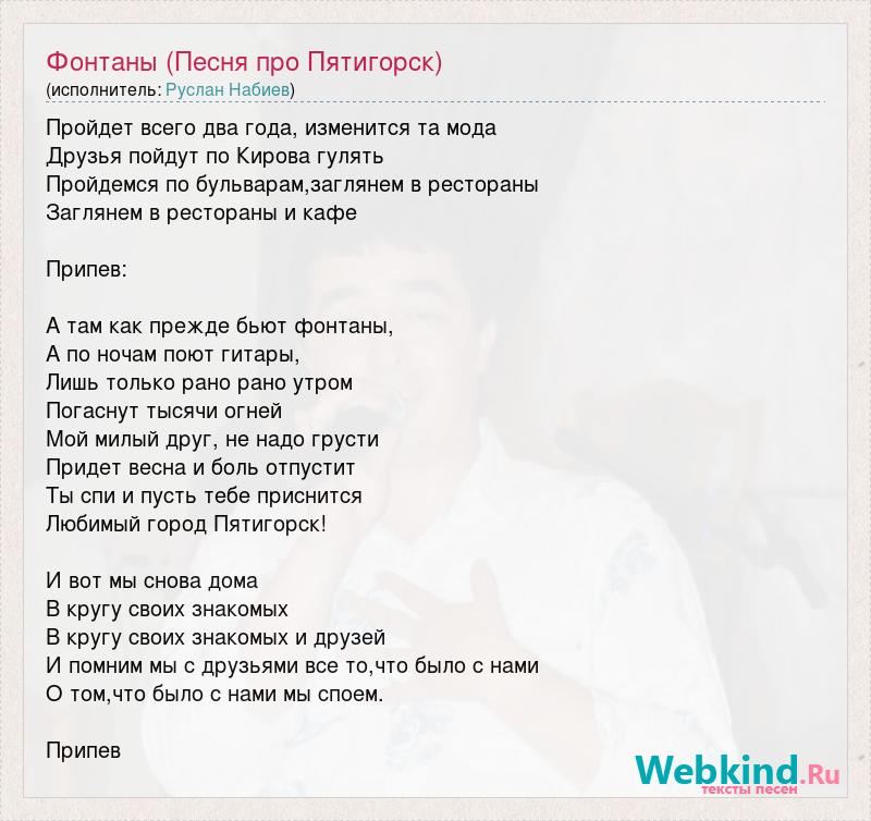 Пройдет всего два года, изменится та мода Друзья пойдут по Кирова гулять Пройдемся по бульварам,заглянем в рестораны Заглянем в рестораны и кафе Припев: А там как прежде бьют фонтаны, А по ночам поют гитары, Лишь только рано рано утром Погаснут тысячи огней Мой милый друг, не надо грусти Придет весна и боль отпустит Ты спи и пусть тебе приснится Любимый город Пятигорск! И вот мы снова дома В кругу своих знакомых В кругу своих знакомых и друзей И помним мы с друзьями все то,что было с нами О том,что было с нами мы споем. Припев
