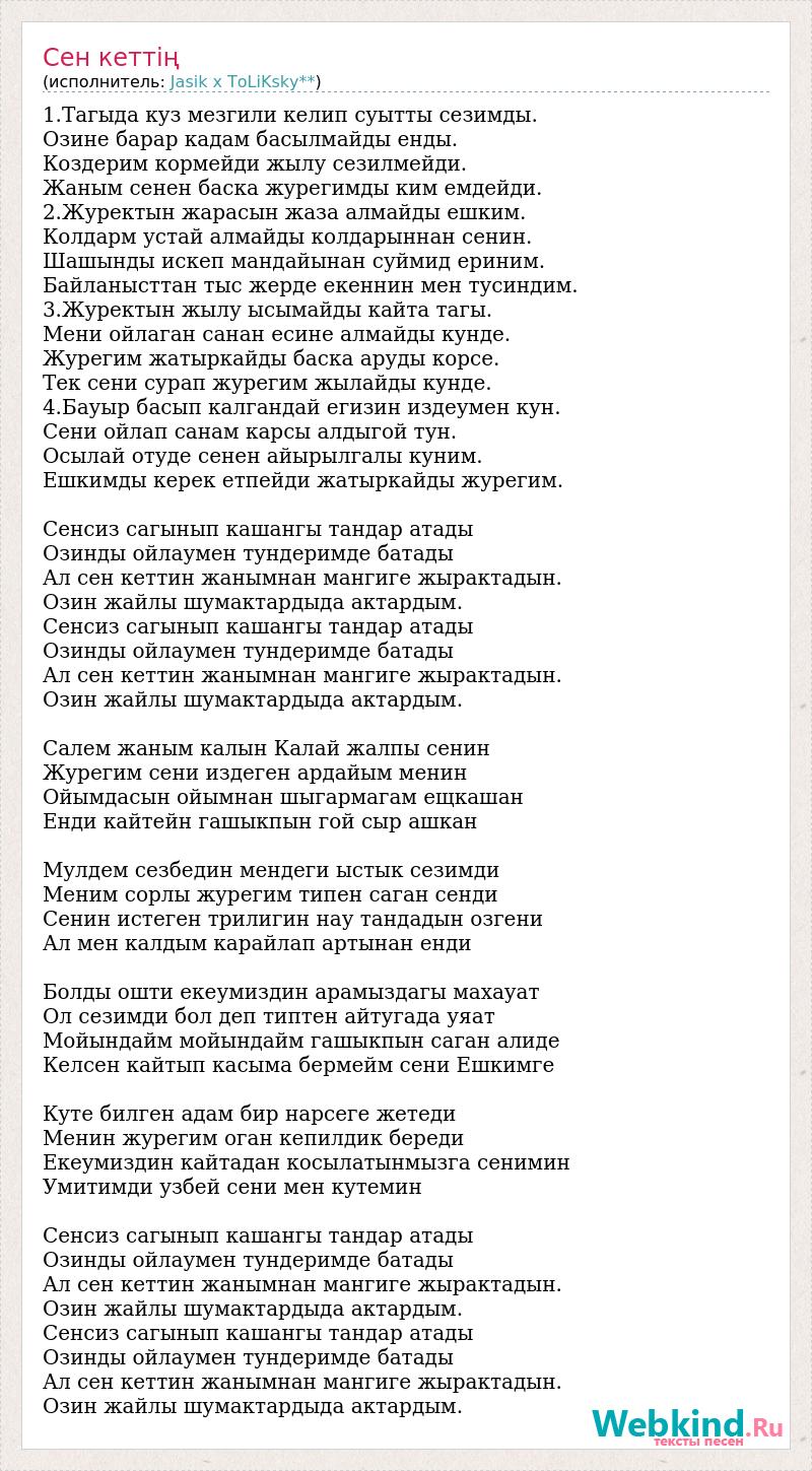 1.Тагыда куз мезгили келип суытты сезимды. Озине барар кадам басылмайды енды. Коздерим кормейди жылу сезилмейди. Жаным сенен баска журегимды ким емдейди. 2.Журектын жарасын жаза алмайды ешким. Колдарм устай алмайды колдарыннан сенин. Шашынды искеп мандайынан суймид ериним. Байланысттан тыс жерде екеннин мен тусиндим. 3.Журектын жылу ысымайды кайта тагы. Мени ойлаган санан есине алмайды кунде. Журегим жатыркайды баска аруды корсе. Тек сени сурап журегим жылайды кунде. 4.Бауыр басып калгандай егизин издеумен кун. Сени ойлап санам карсы алдыгой тун. Осылай отуде сенен айырылгалы куним. Ешкимды керек етпейди жатыркайды журегим. Сенсиз сагынып кашангы тандар атады Озинды ойлаумен тундеримде батады Ал сен кеттин жанымнан мангиге жырактадын. Озин жайлы шумактардыда актардым. Сенсиз сагынып кашангы тандар атады Озинды ойлаумен тундеримде батады Ал сен кеттин жанымнан мангиге жырактадын. Озин жайлы шумактардыда актардым. Салем жаным калын Калай жалпы сенин Журегим сени издеген ардайым менин Ойымдасын ойымнан шыгармагам ещкашан Енди кайтейн гашыкпын гой сыр ашкан Мулдем сезбедин мендеги ыстык сезимди Меним сорлы журегим типен саган сенди Сенин истеген трилигин нау тандадын озгени Ал мен калдым карайлап артынан енди Болды ошти екеумиздин арамыздагы махауат Ол сезимди бол деп типтен айтугада уяат Мойындайм мойындайм гашыкпын саган алиде Келсен кайтып касыма бермейм сени Ешкимге Куте билген адам бир нарсеге жетеди Менин журегим оган кепилдик береди Екеумиздин кайтадан косылатынмызга сенимин Умитимди узбей сени мен кутемин Сенсиз сагынып кашангы тандар атады Озинды ойлаумен тундеримде батады Ал сен кеттин жанымнан мангиге жырактадын. Озин жайлы шумактардыда актардым. Сенсиз сагынып кашангы тандар атады Озинды ойлаумен тундеримде батады Ал сен кеттин жанымнан мангиге жырактадын. Озин жайлы шумактардыда актардым.