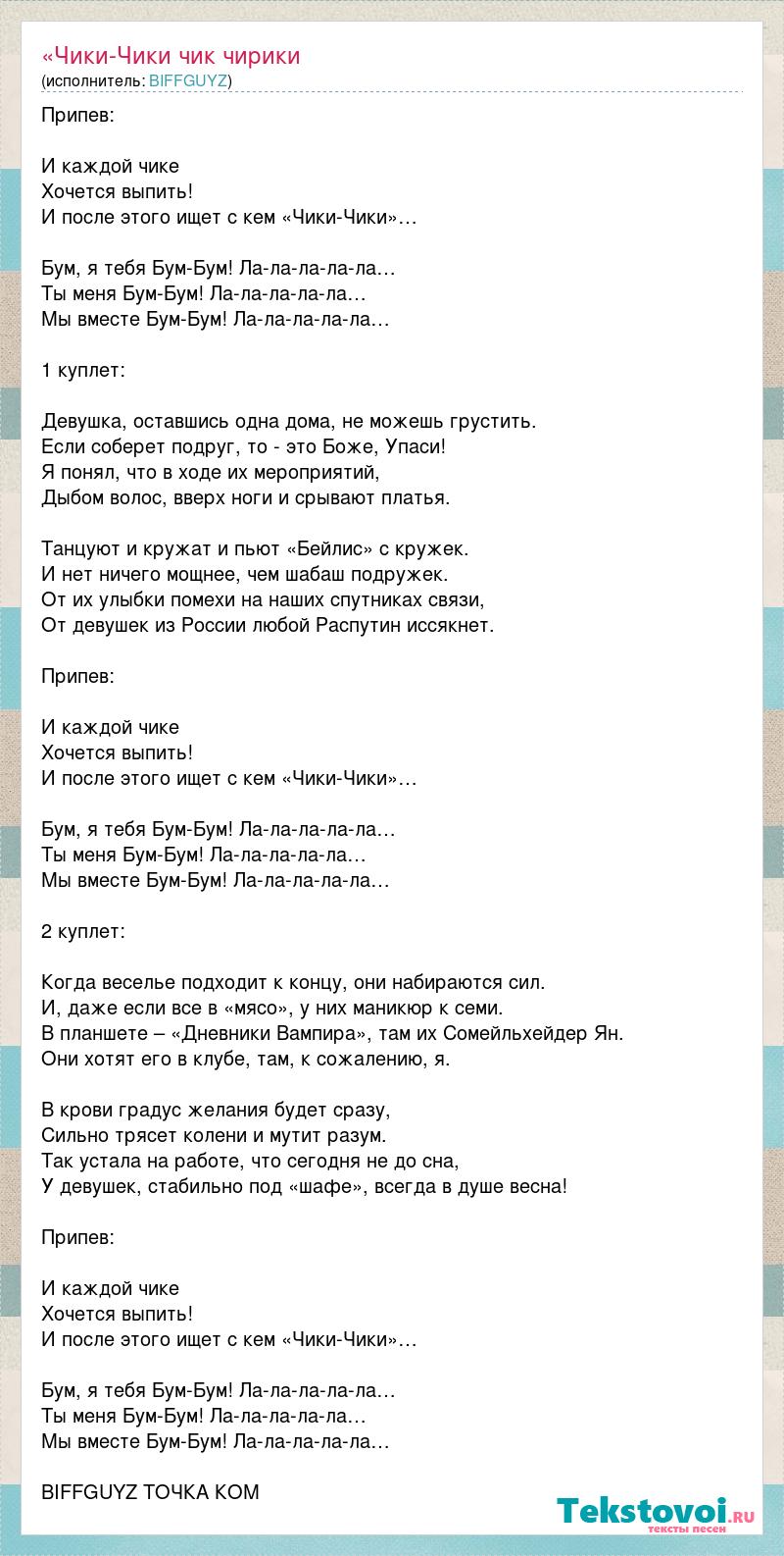 Припев: И каждой чике Хочется выпить! И после этого ищет с кем «Чики-Чики»… Бум, я тебя Бум-Бум! Ла-ла-ла-ла-ла… Ты меня Бум-Бум! Ла-ла-ла-ла-ла… Мы вместе Бум-Бум! Ла-ла-ла-ла-ла… 1 куплет: Девушка, оставшись одна дома, не можешь грустить. Если соберет подруг, то - это Боже, Упаси! Я понял, что в ходе их мероприятий, Дыбом волос, вверх ноги и срывают платья. Танцуют и кружат и пьют «Бейлис» с кружек. И нет ничего мощнее, чем шабаш подружек. От их улыбки помехи на наших спутниках связи, От девушек из России любой Распутин иссякнет. Припев: И каждой чике Хочется выпить! И после этого ищет с кем «Чики-Чики»… Бум, я тебя Бум-Бум! Ла-ла-ла-ла-ла… Ты меня Бум-Бум! Ла-ла-ла-ла-ла… Мы вместе Бум-Бум! Ла-ла-ла-ла-ла… 2 куплет: Когда веселье подходит к концу, они набираются сил. И, даже если все в «мясо», у них маникюр к семи. В планшете – «Дневники Вампира», там их Сомейльхейдер Ян. Они хотят его в клубе, там, к сожалению, я. В крови градус желания будет сразу, Сильно трясет колени и мутит разум. Так устала на работе, что сегодня не до сна, У девушек, стабильно под «шафе», всегда в душе весна! Припев: И каждой чике Хочется выпить! И после этого ищет с кем «Чики-Чики»… Бум, я тебя Бум-Бум! Ла-ла-ла-ла-ла… Ты меня Бум-Бум! Ла-ла-ла-ла-ла… Мы вместе Бум-Бум! Ла-ла-ла-ла-ла… BIFFGUYZ ТОЧКА КОМ