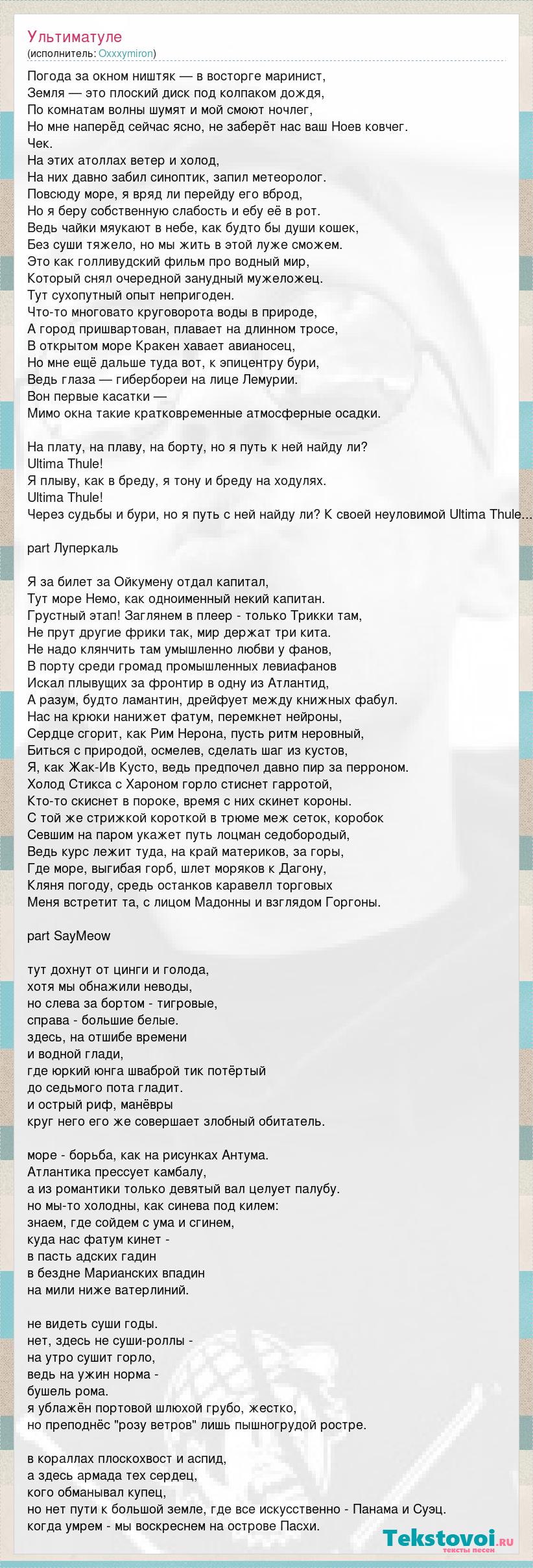 Погода за окном ништяк — в восторге маринист, Земля — это плоский диск под колпаком дождя, По комнатам волны шумят и мой смоют ночлег, Но мне наперёд сейчас ясно, не заберёт нас ваш Ноев ковчег. Чек. На этих атоллах ветер и холод, На них давно забил синоптик, запил метеоролог. Повсюду море, я вряд ли перейду его вброд, Но я беру собственную слабость и ебу её в рот. Ведь чайки мяукают в небе, как будто бы души кошек, Без суши тяжело, но мы жить в этой луже сможем. Это как голливудский фильм про водный мир, Который снял очередной занудный мужеложец. Тут сухопутный опыт непригоден. Что-то многовато круговорота воды в природе, А город пришвартован, плавает на длинном тросе, В открытом море Кракен хавает авианосец, Но мне ещё дальше туда вот, к эпицентру бури, Ведь глаза — гибербореи на лице Лемурии. Вон первые касатки — Мимо окна такие кратковременные атмосферные осадки. На плату, на плаву, на борту, но я путь к ней найду ли? Ultima Thule! Я плыву, как в бреду, я тону и бреду на ходулях. Ultima Thule! Через судьбы и бури, но я путь с ней найду ли? К своей неуловимой Ultima Thule... part Луперкаль Я за билет за Ойкумену отдал капитал, Тут море Немо, как одноименный некий капитан. Грустный этап! Заглянем в плеер - только Трикки там, Не прут другие фрики так, мир держат три кита. Не надо клянчить там умышленно любви у фанов, В порту среди громад промышленных левиафанов Искал плывущих за фронтир в одну из Атлантид, А разум, будто ламантин, дрейфует между книжных фабул. Нас на крюки нанижет фатум, перемкнет нейроны, Сердце сгорит, как Рим Нерона, пусть ритм неровный, Биться с природой, осмелев, сделать шаг из кустов, Я, как Жак-Ив Кусто, ведь предпочел давно пир за перроном. Холод Стикса с Хароном горло стиснет гарротой, Кто-то скиснет в пороке, время с них скинет короны. С той же стрижкой короткой в трюме меж сеток, коробок Севшим на паром укажет путь лоцман седобородый, Ведь курс лежит туда, на край материков, за горы, Где море, выгибая горб, шлет моряков к Дагону, Кляня погоду, средь останков каравелл торговых Меня встретит та, с лицом Мадонны и взглядом Горгоны. part SayMeow тут дохнут от цинги и голода, хотя мы обнажили неводы, но слева за бортом - тигровые, справа - большие белые. здесь, на отшибе времени и водной глади, где юркий юнга шваброй тик потёртый до седьмого пота гладит. и острый риф, манёвры круг него его же совершает злобный обитатель. море - борьба, как на рисунках Антума. Атлантика прессует камбалу, а из романтики только девятый вал целует палубу. но мы-то холодны, как синева под килем: знаем, где сойдем с ума и сгинем, куда нас фатум кинет - в пасть адских гадин в бездне Марианских впадин на мили ниже ватерлиний. не видеть суши годы. нет, здесь не суши-роллы - на утро сушит горло, ведь на ужин норма - бушель рома. я ублажён портовой шлюхой грубо, жестко, но преподнёс "розу ветров" лишь пышногрудой ростре. в кораллах плоскохвост и аспид, а здесь армада тех сердец, кого обманывал купец, но нет пути к большой земле, где все искусственно - Панама и Суэц. когда умрем - мы воскреснем на острове Пасхи.